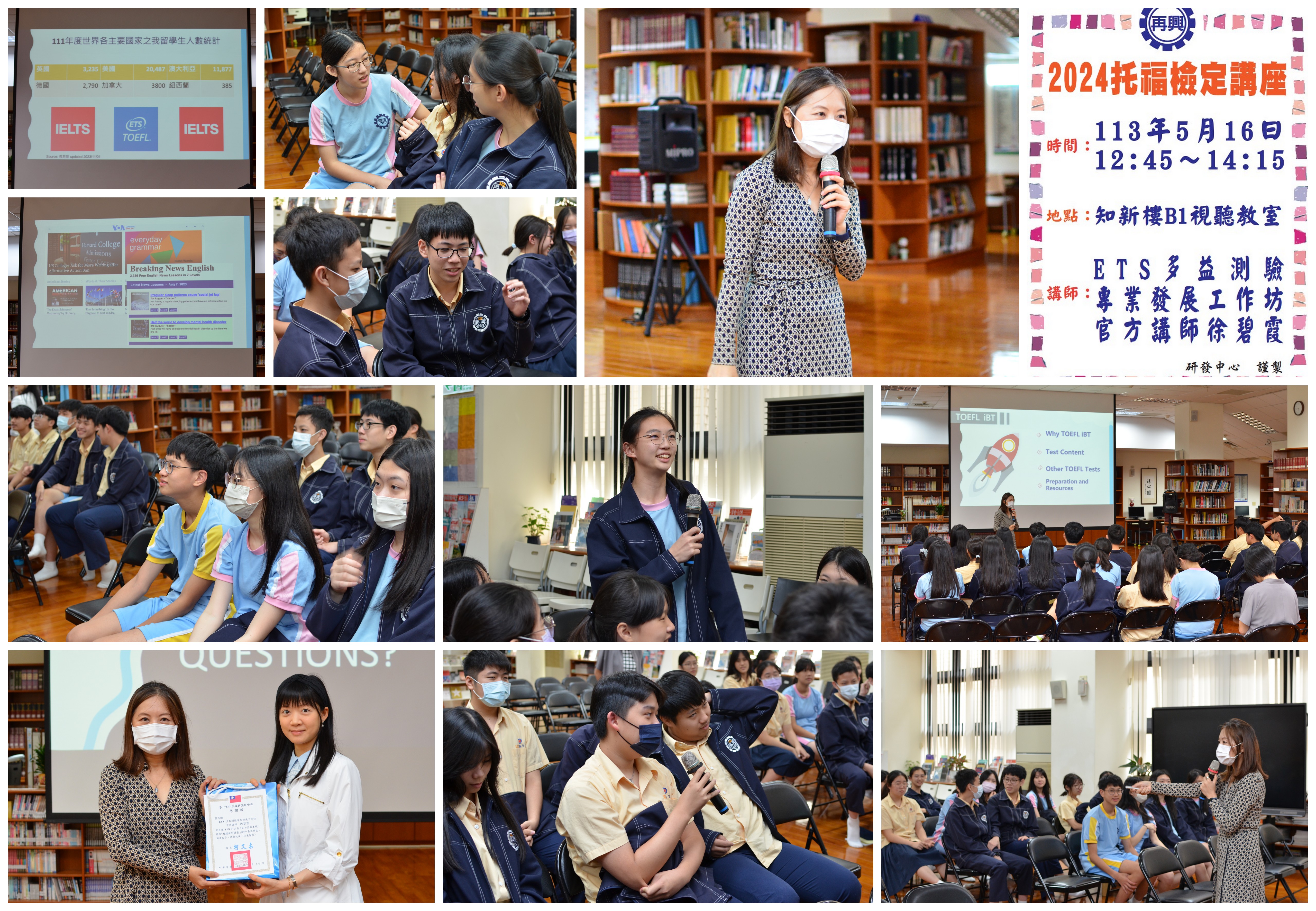 本校於5月16日舉辦「托福檢定講座」,邀請ETS 多益測驗專業發展工作坊官方講師 徐碧霞蒞校主講,協助學生了解托福檢定與準備方向,本場講座共有35位高中部學生報名參加。托福網路測驗(TOEFL iBT)是現階段北美洲大學入學許可之認證考試,其測驗成績於全世界130多個國家,超過8,500所的學校、學術機構與各級政府單位所接受。講師首先介紹TOEFL iBT 的測驗內容,接著藉由範例題目引導學生練習,詳盡說明聽說讀寫四大面向的準備要點,學生從問答的互動中掌握答題技巧,收穫豐碩。最後,講師總結托福考試需具備的能力,並分享相關備考資源連結,鼓勵學生持續精進英文學習,累積應考實力。