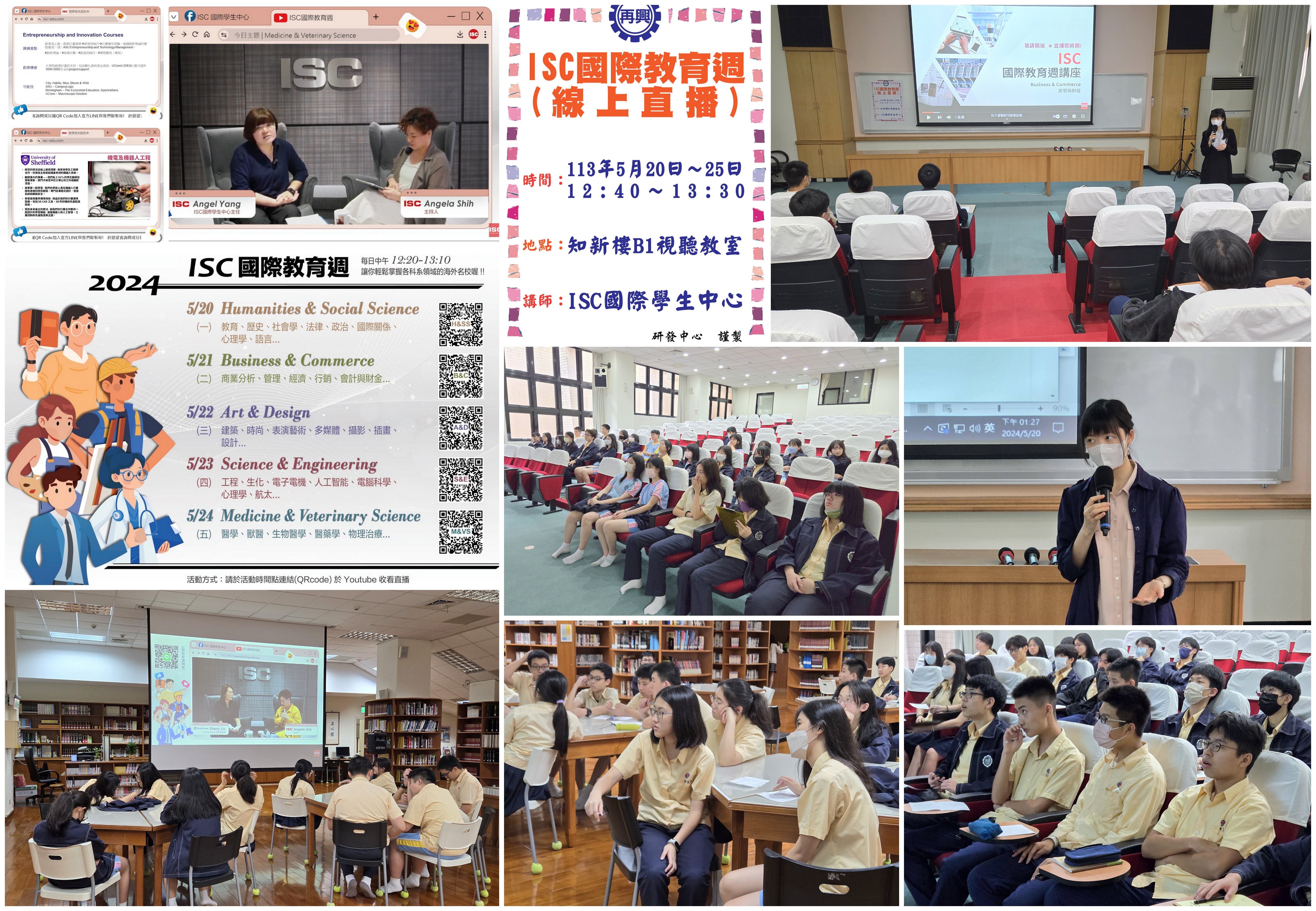 ISC國際學生中心於5/20(一)至5/24(五)舉辦「國際教育週」系列講座,邀請臺灣各校學生及家長透過Youtube觀看現場直播,了解五大學群的海外名校選擇以及申請準備方向。本校各場次皆有高一、二的同學報名,統一於午休時間在知新樓B1視聽室參與線上講座。