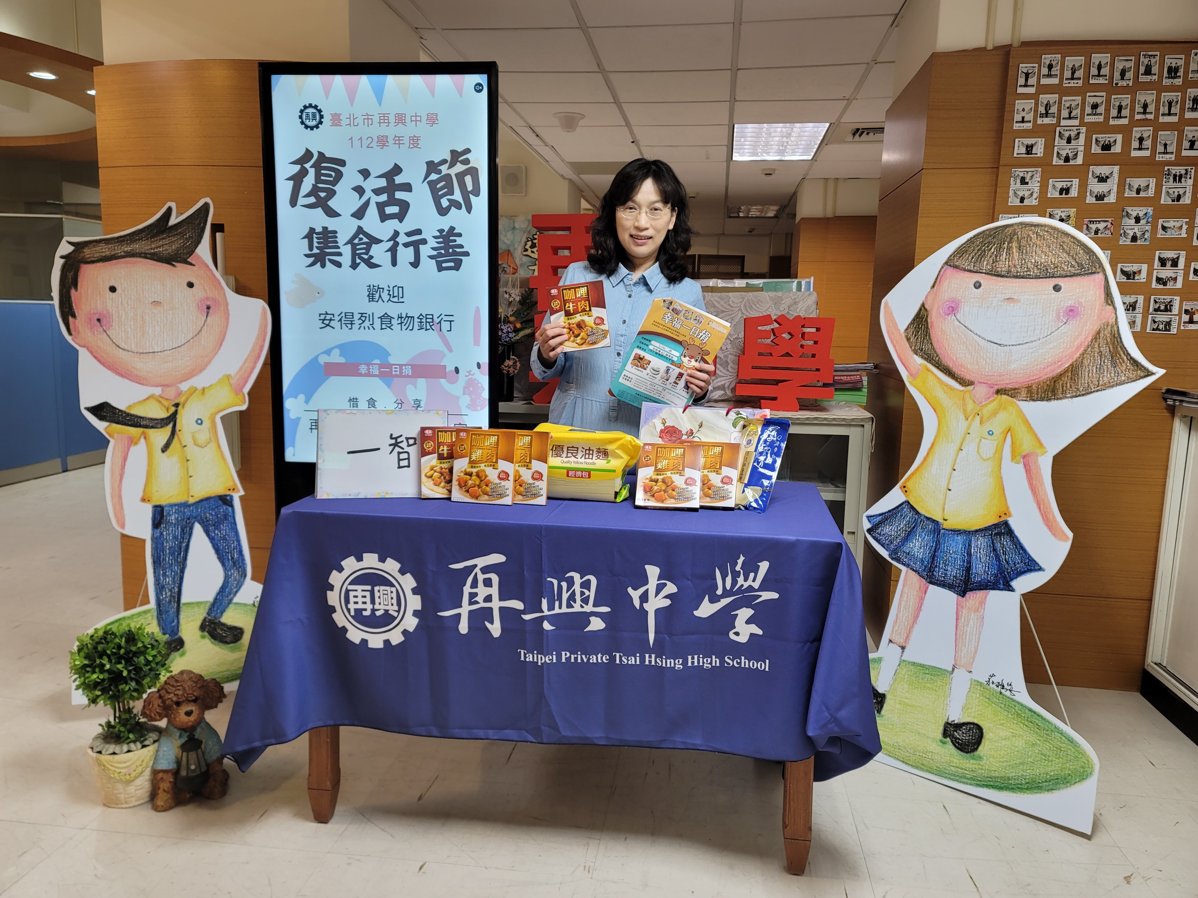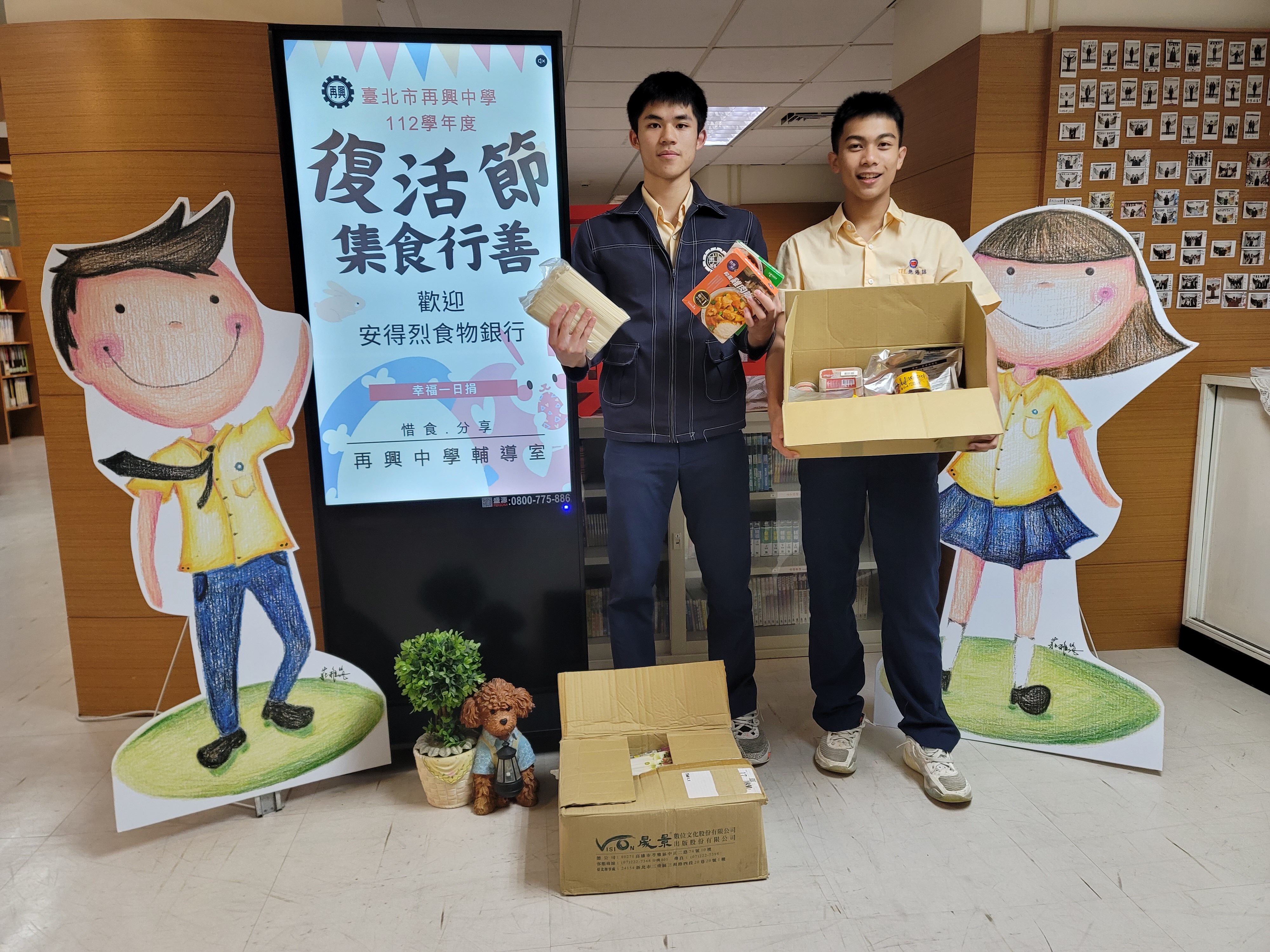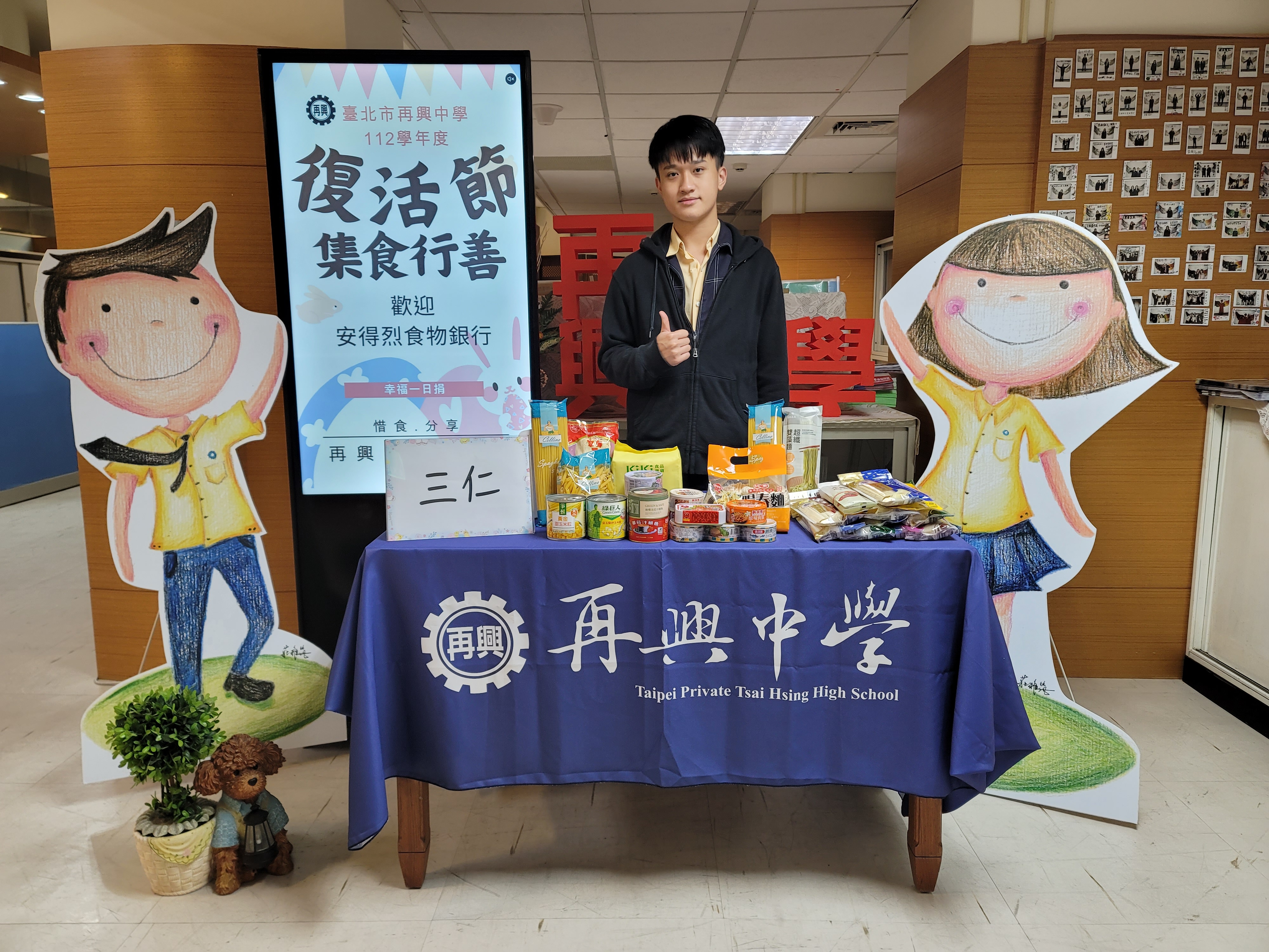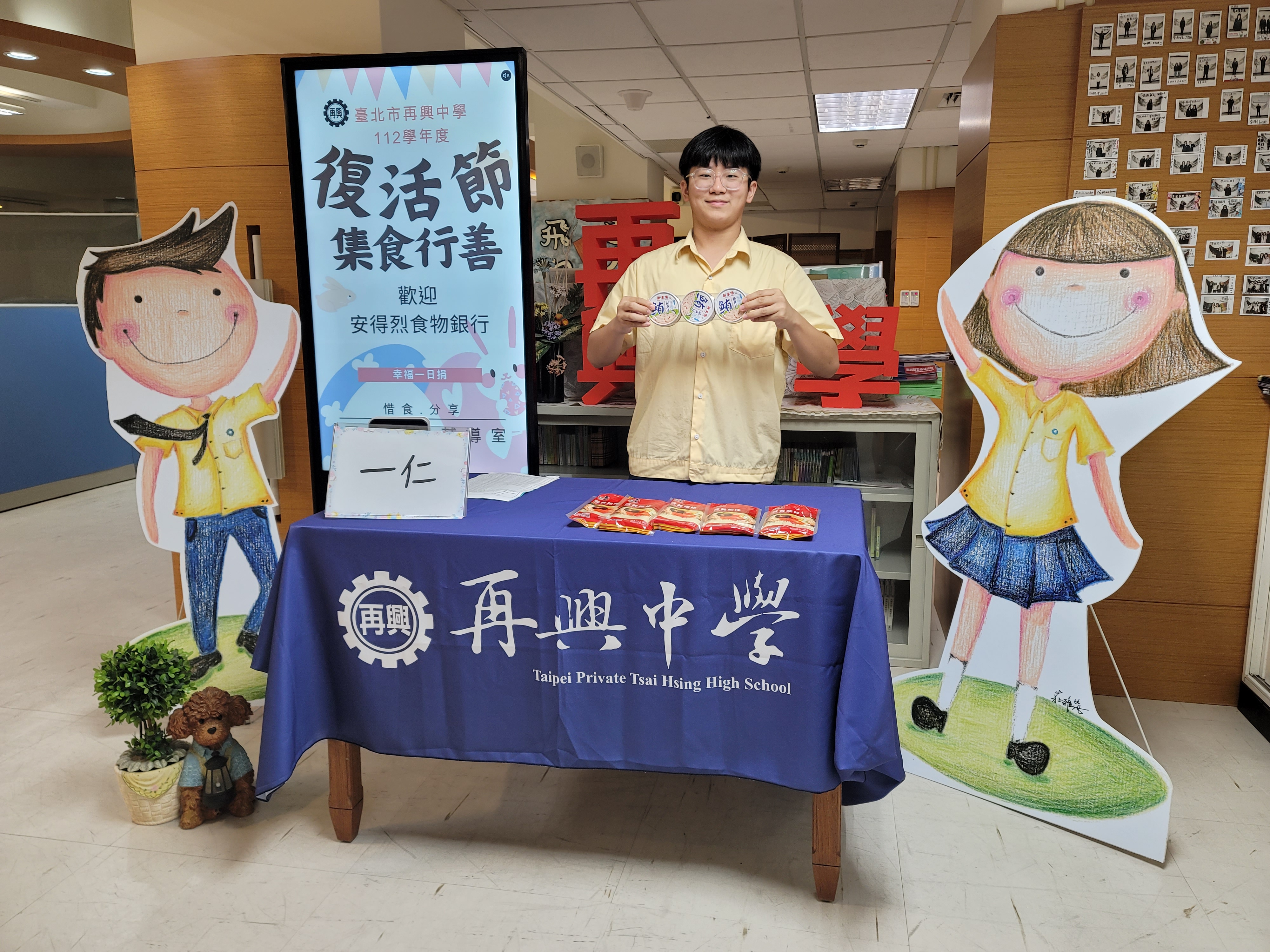 在復活節的溫馨氛圍中,輔導室於113年3月29日與安得烈食物銀行合作舉辦意義非凡的集食行善活動:「幸福一日捐」,旨在分享惜食,終止飢餓,並為社會公義盡一份心力。這場活動不僅讓學生感受到了節日的溫暖,更唤起了學生對弱勢群體的關懷與支持,活動期間,全校師生携帶食物捐贈,為那些需要幫助的人獻上一份溫暖,無論是罐頭、調理包,抑或是麵條,每一樣物品都蘊含著再興師生的心意與關懷。