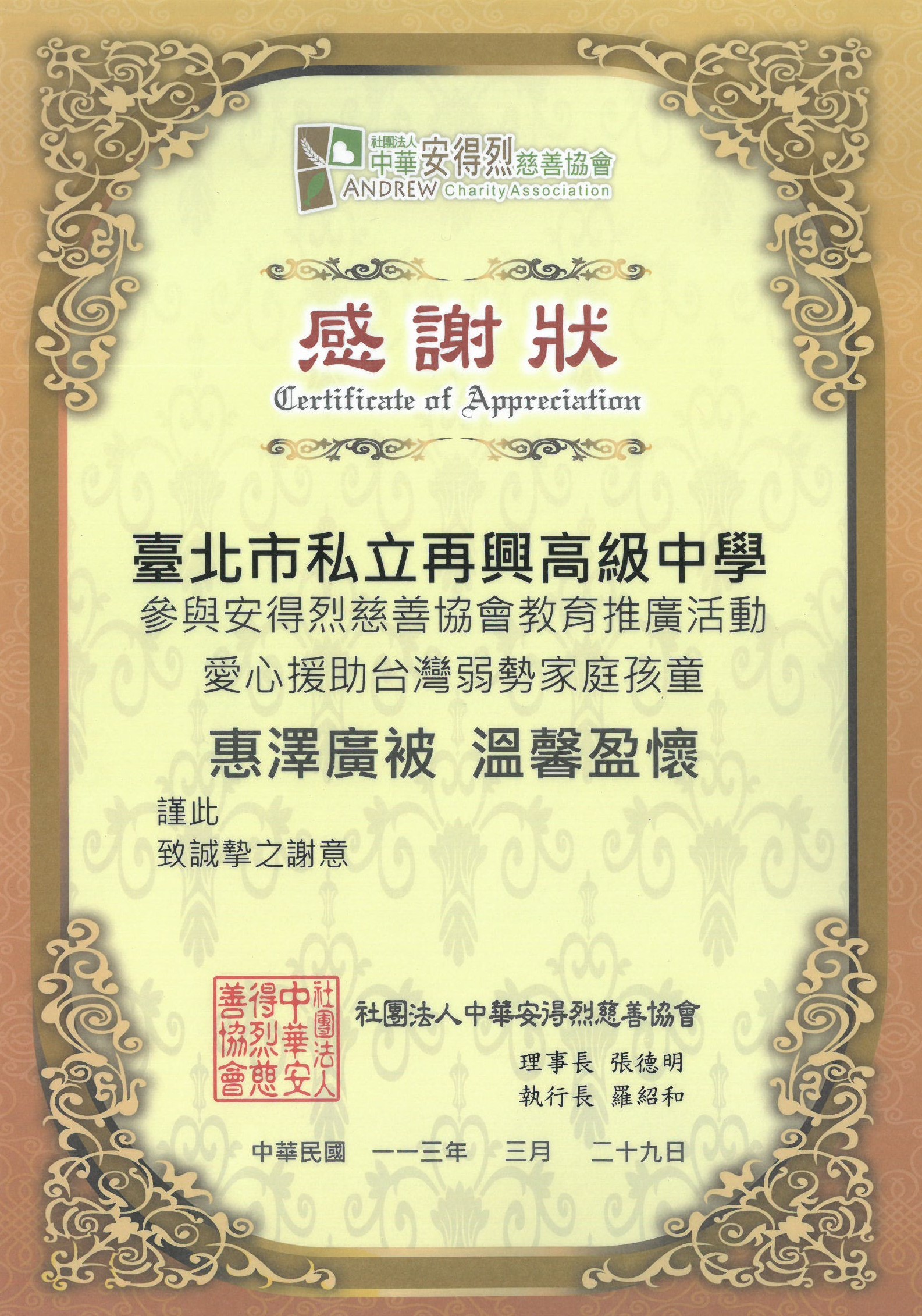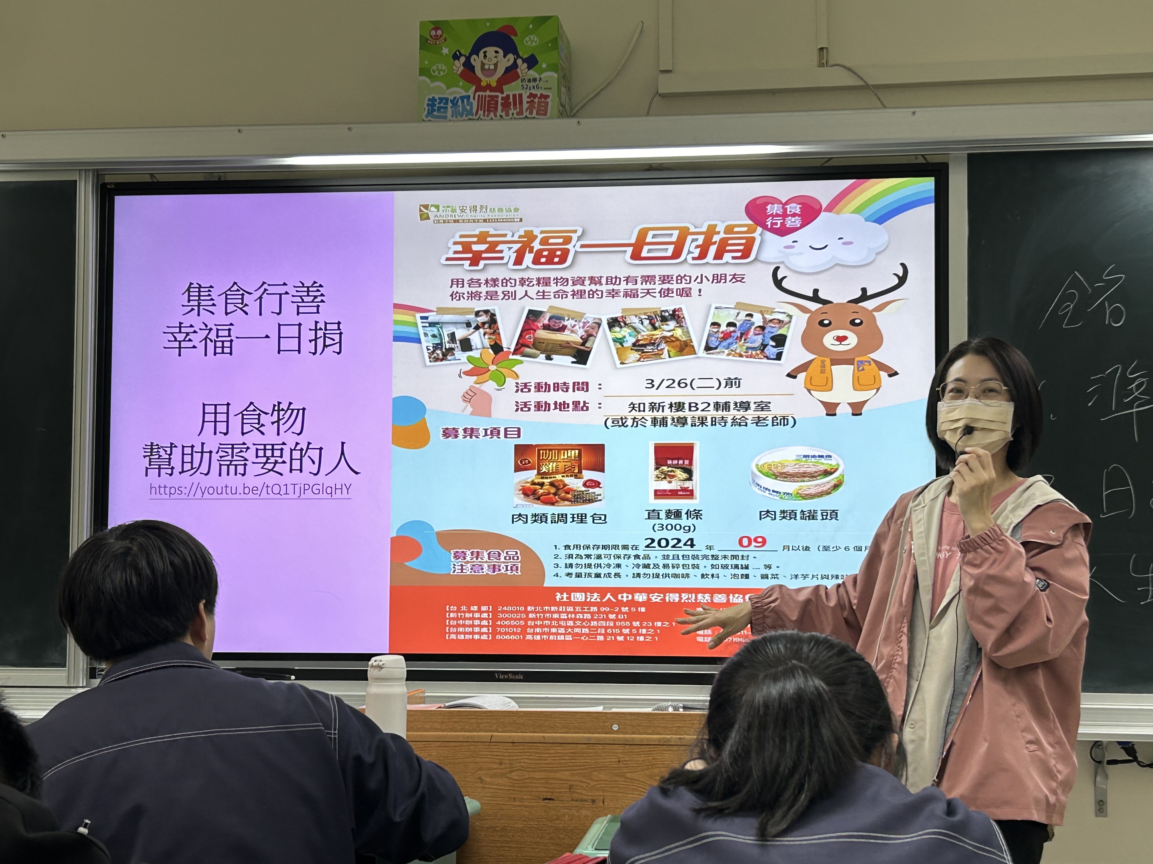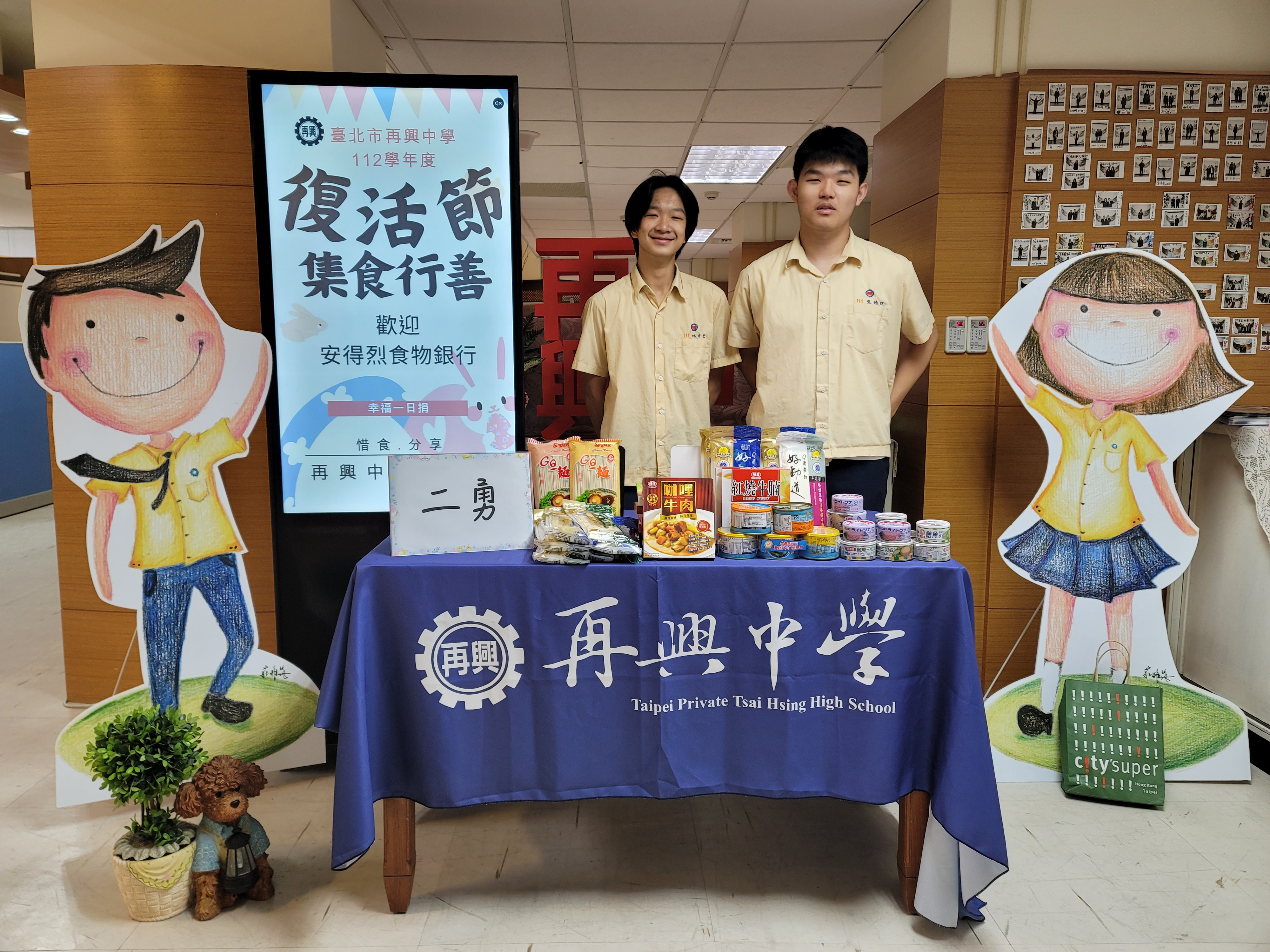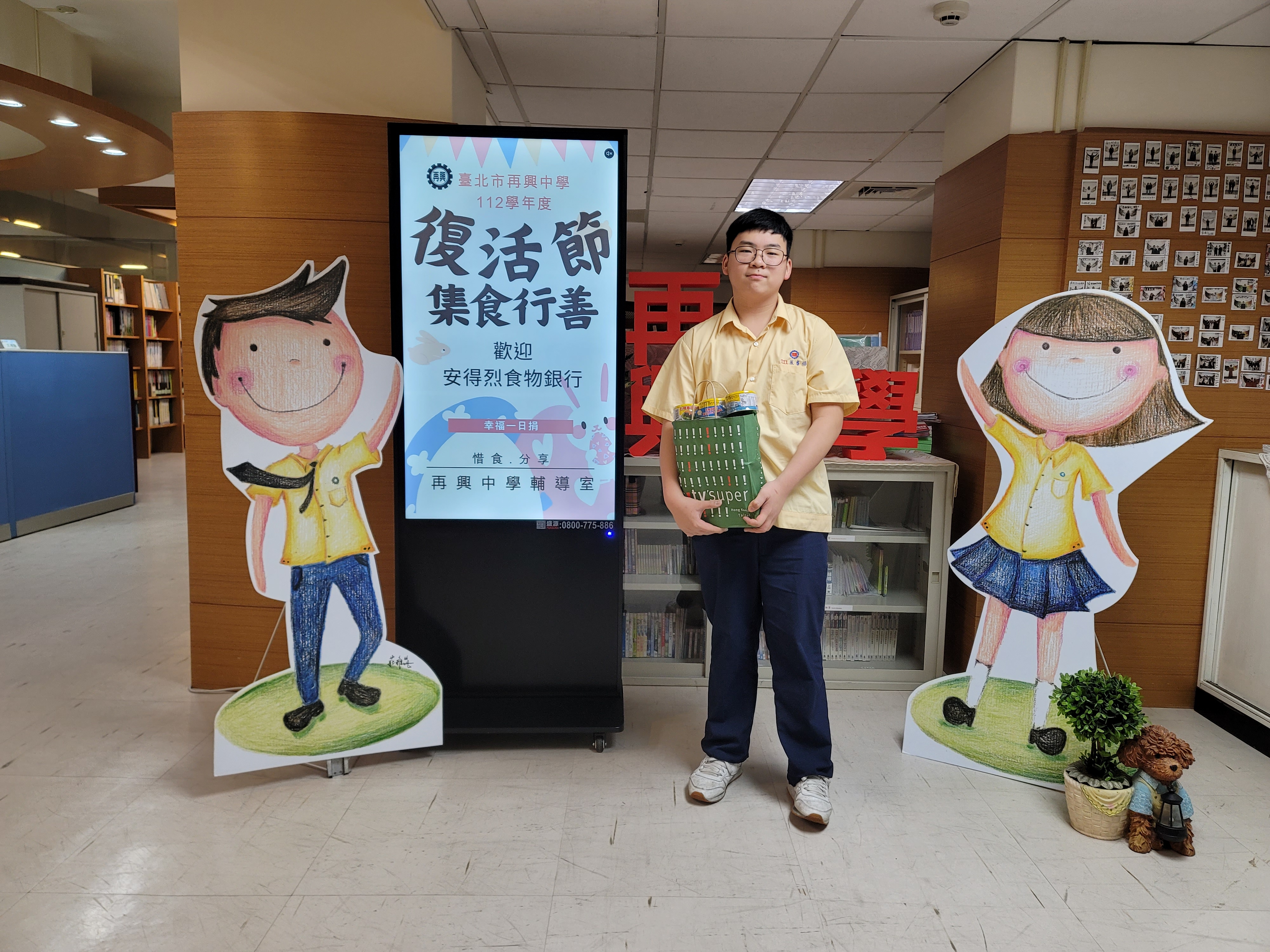 在復活節的溫馨氛圍中,輔導室於113年3月29日與安得烈食物銀行合作舉辦意義非凡的集食行善活動:「幸福一日捐」,旨在分享惜食,終止飢餓,並為社會公義盡一份心力。這場活動不僅讓學生感受到了節日的溫暖,更唤起了學生對弱勢群體的關懷與支持,活動期間,全校師生携帶食物捐贈,為那些需要幫助的人獻上一份溫暖,無論是罐頭、調理包,抑或是麵條,每一樣物品都蘊含著再興師生的心意與關懷。