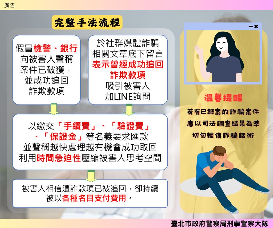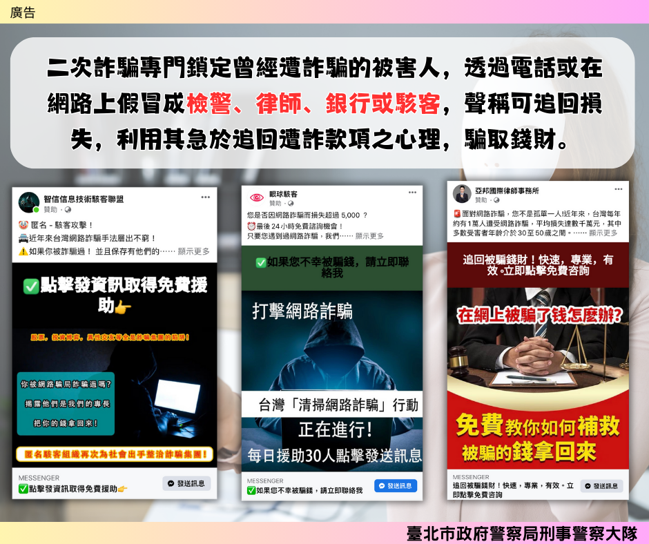 一、依據市府警察局113年3月7日北市警刑經字第1133025399號函辦理。 二、為賡續落實分齡分眾識詐宣導教育,本月份以解除分期付款、假愛情交友、二次詐騙手法為宣導主軸,請全校師生與家長注意防範。