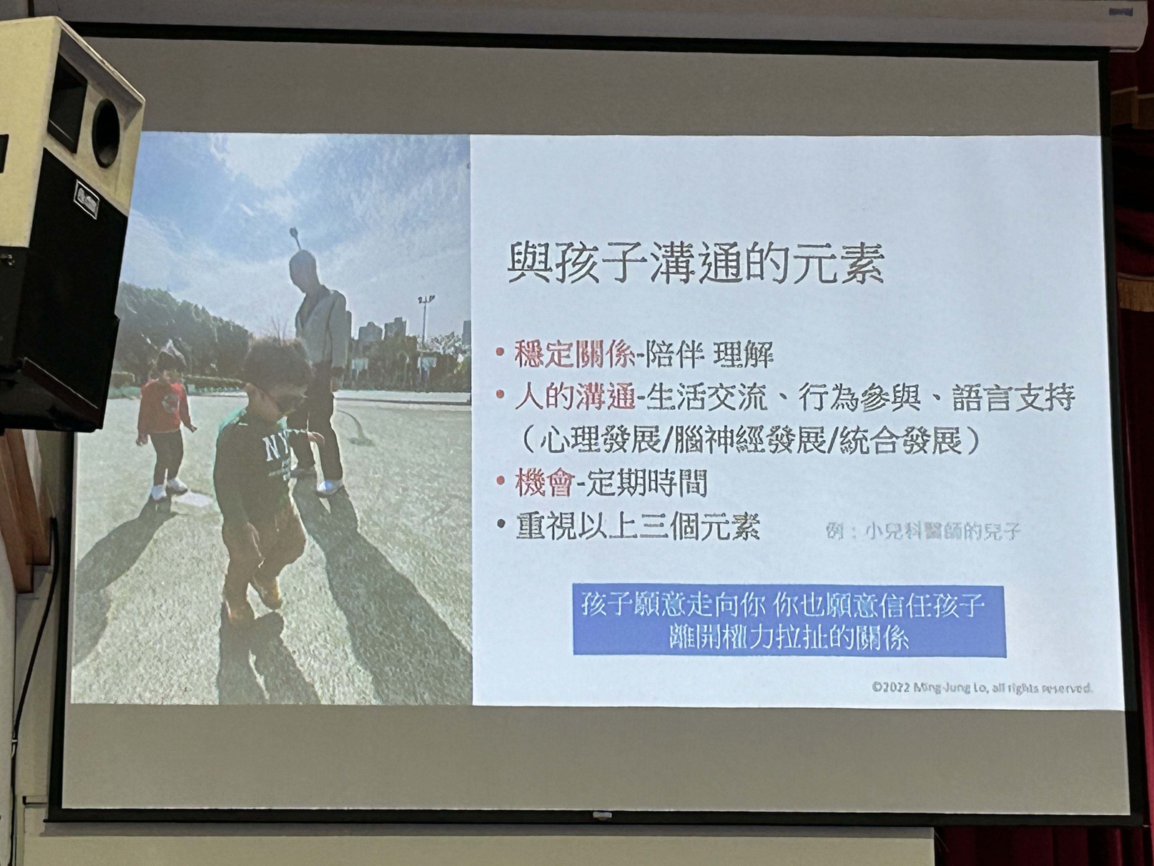 當問題出現,請勿一直關注問題,請勿急著解決問題,而是慢下腳步與孩子進行連結,讓孩子覺得安全,成為他信任的人,然後再一步一步想辦法。您是帶給孩子安全感的那個最重要的人!祝福大家都可以建立溫暖有效的安全溝通,互相陪伴與照顧,讓我們在孩子們成長的路上,也一起學習成長吧!(詳細演講內容刊登於113年11月出版之684期再興月刊“心靈饗宴”專欄)