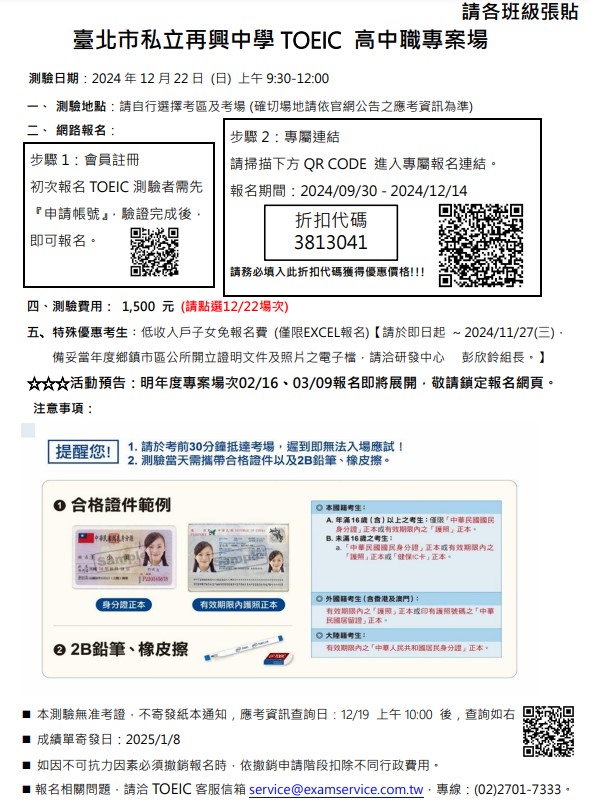 說明:本校參與忠欣公司規劃的「TOEIC公開測驗專案考-高中職專場」團體優惠方案