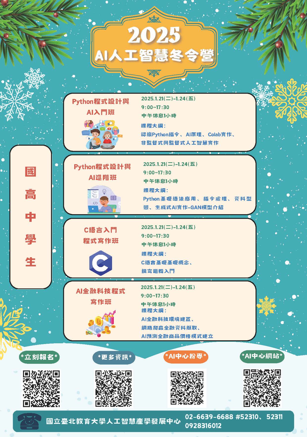二、班別包含「快快樂樂玩AI」、「Python程式設計與AI入門 班」、「Python程式設計與AI進階班」、「C語言入門程式寫班」、