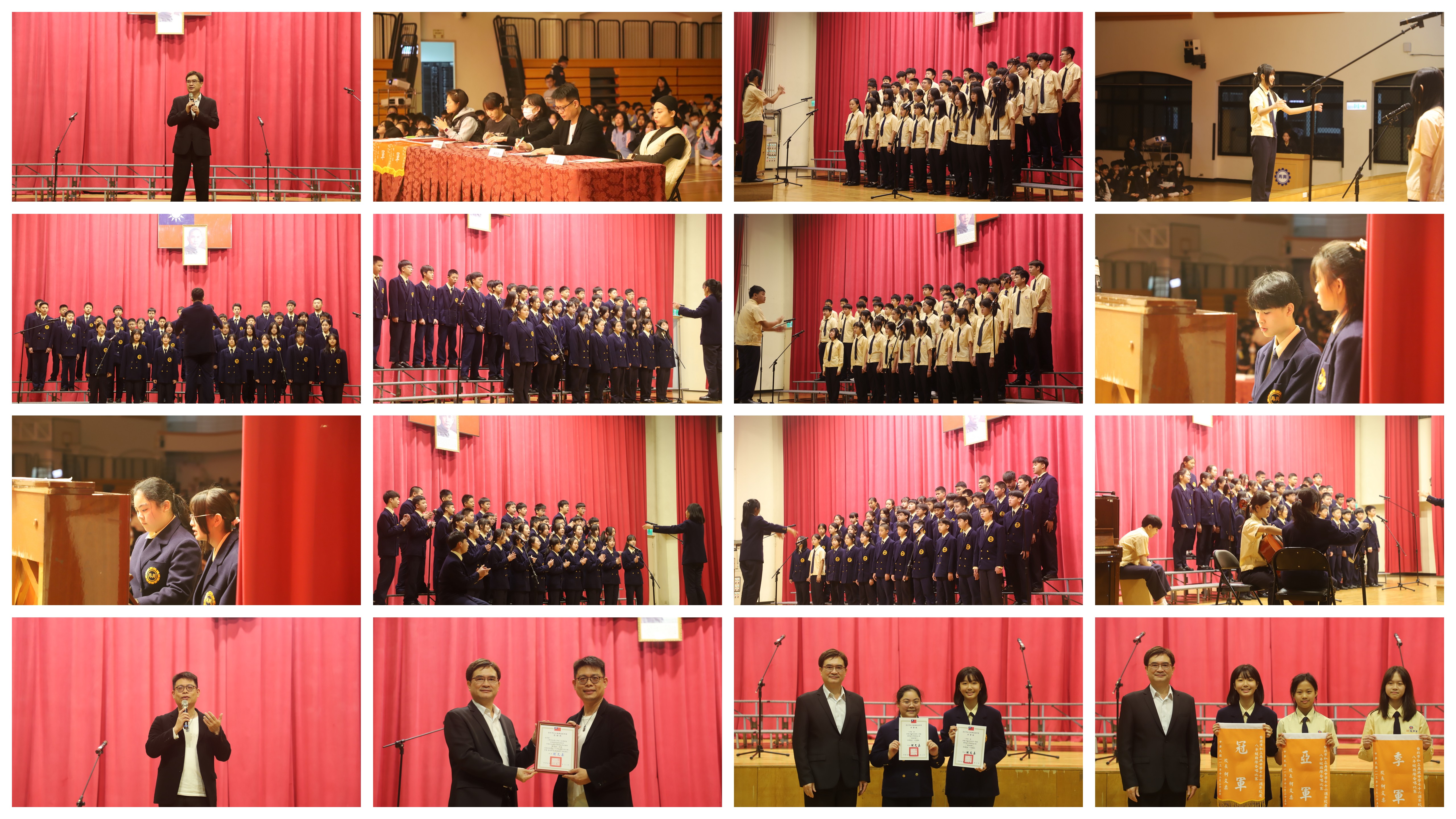 本校113學年度第1學期國中部八年級合唱比賽由學務處主辦,於113年12月11日國中部週會時間假本校知新樓B3體育館舉行。本項活動特別聘請專業合唱音樂教師林育誼老師、向芳誼主任以及沈心宇老師擔任評審。八年級各班紛展平日音樂課練習成果,每班除全體同學上台參加比賽外,指揮及鋼琴伴奏均由各班同學擔任,完全不假他人之手;經激烈競爭後,成績名次如下: