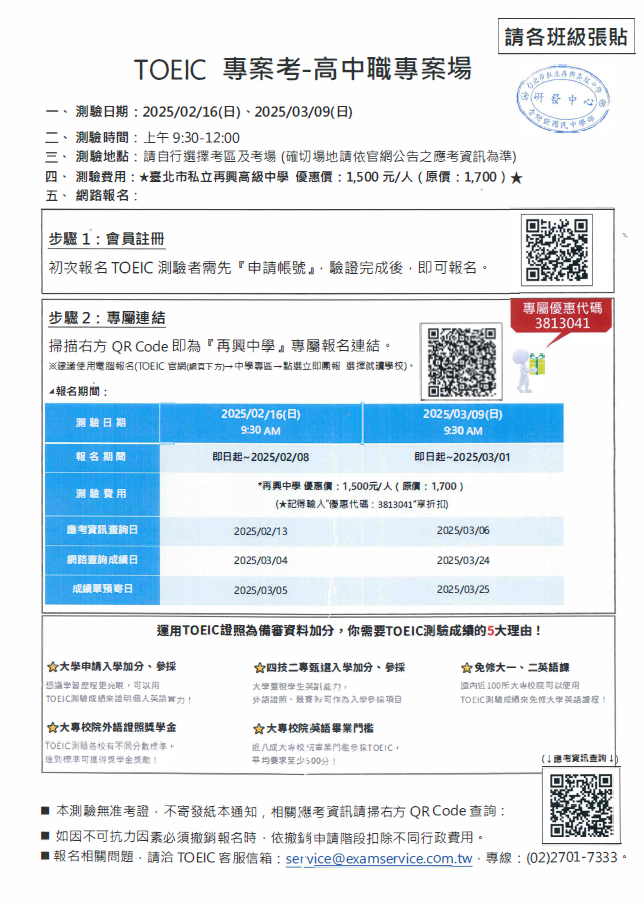 說明:本校參與忠欣公司規劃的「TOEIC公開測驗專案考-高中職專場」團體優惠方案