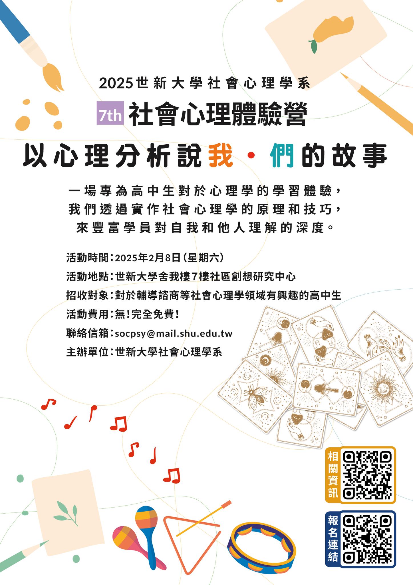 第七屆社心體驗營是一場專為高中生對於心理學的學習體驗,我們透過實作社會心理學的原理和技巧,來豐富學員對自我和他人理解的深度。這不僅是關於知識的學習,更是自我暸解與成長的契機,以及培養同理心和增進人際互動的重要途徑。