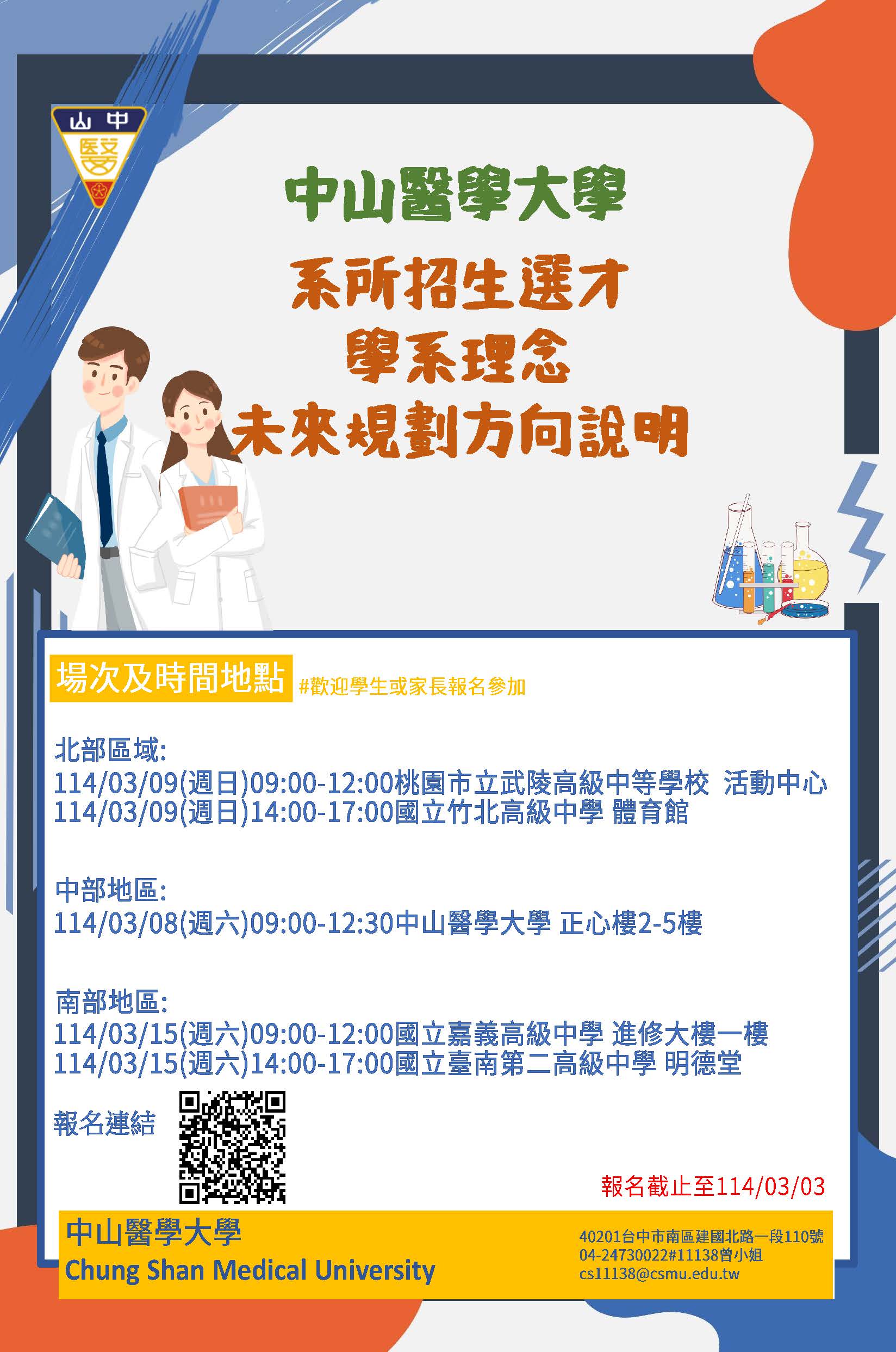 一、活動目的:為使家長和學生深入瞭解中山醫學大學各學系的教學理念和未來規劃方向,特辦理說明會以增進家長對學校的信心,與充分掌握如何準備114學年度大學多元入學考試方向。