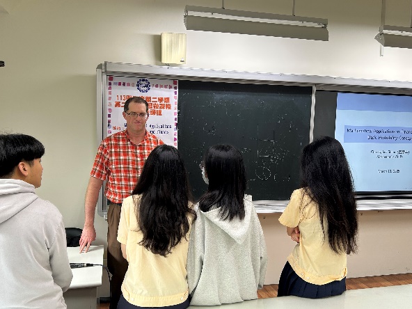 3月13日Chris Shane宣南丰教授蒞臨本校進行本學期第一場財經素養課程專題講座,講題是「Mathematical Applications in Economics and Finance」。宣教授於美國密蘇里大學獲得數學博士學位,曾任教於美國西南奧克拉荷馬州立大學數學系。教授的教學專長包括統計學、程式語言及數學在金融上的應用,並在本次講座以全英文互動式的教學,以複利、現值以及期望值作為三大主題,進行公式的推導與生活中的應用之討論。