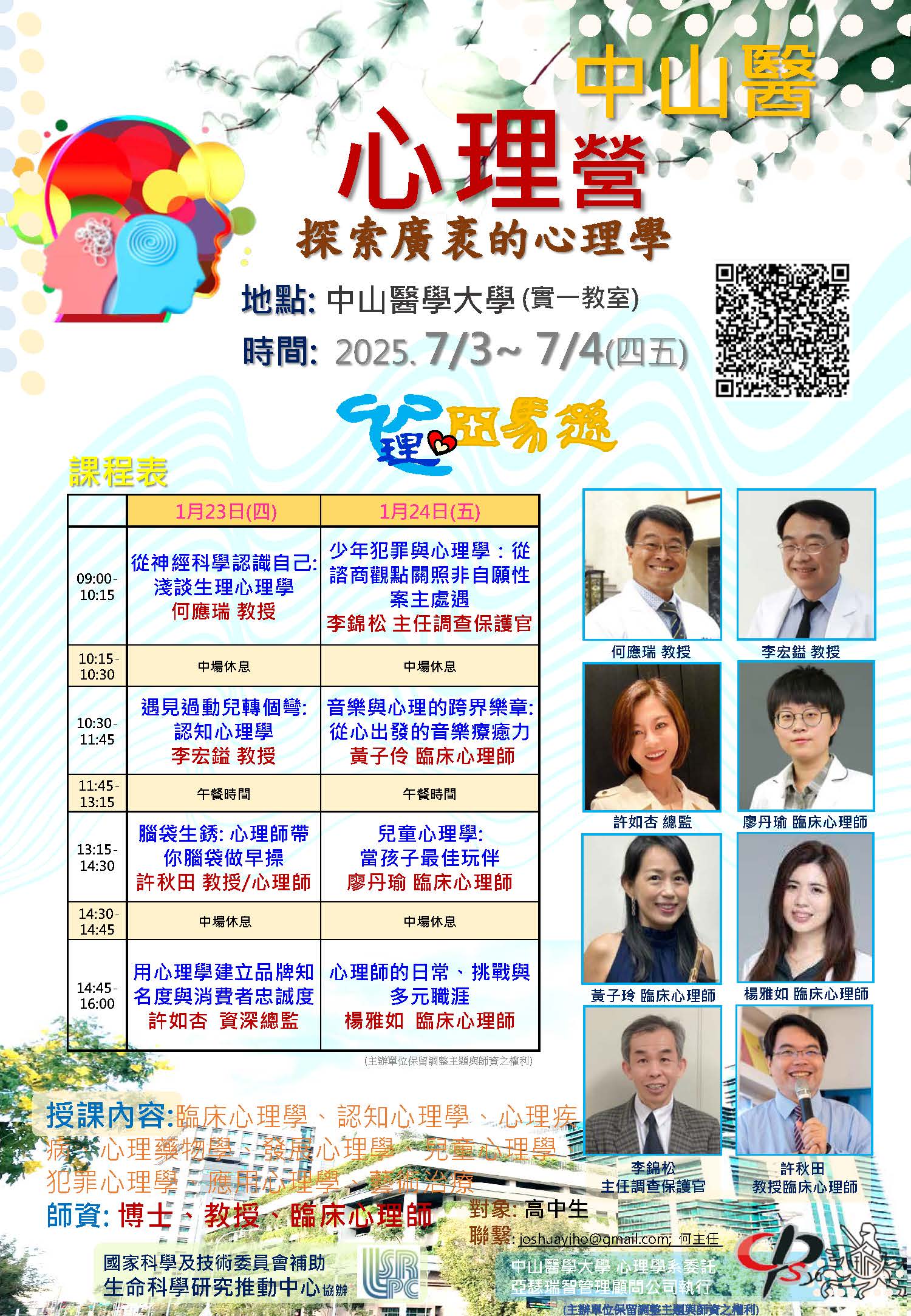 一、提升高中生對心理相關學系之了解,特規劃心理營,歡迎 報名參加。