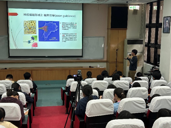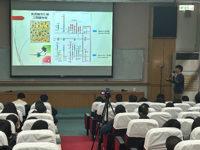 高教授首先簡要介紹神經科學的基本概念,說明神經細胞、脊髓與大腦的結構,以及神經系統在這些區域的分佈。隨後,教授深入探討了「神經細胞的發育過程」。他指出,人體神經系統的發育起始於幹細胞的分裂,隨著大量神經細胞的生成,這些細胞開始移動並在不同部位聚集,逐漸分化成多種不同類型的神經細胞。在神經迴路形成的過程中,軸突末端的生長錐通過表面受器感知環境中的化學物質與配體,這些訊息根據傳遞的距離分為遠程與短程。另外根據性質的不同,分為吸引性與排斥性,生長錐則根據這些訊號選擇適當的方向,持續延伸軸突,最終與目標細胞建立突觸,完成神經迴路的建構。