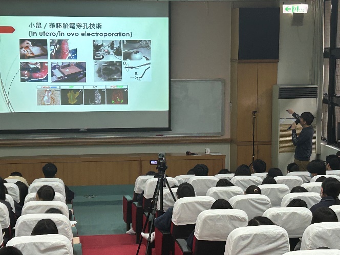 高教授在講座中介紹了實驗室常用的方法 - 電穿孔技術(electroporation),以及實驗中使用的動物模型。透過實際的研究案例,幫助同學快速掌握Eph下游訊息傳導路徑的調控模式。講座從一篇論文的研究問題出發,探討Eph的下游分子paxillin是否參與運動神經元的生長調控。研究發現,paxillin在脊髓外側運動神經柱(lateral motor column, LMC)中有表現,並透過基因剔除與過度表現技術,觀察其對運動神經元軸突導向的影響。經由離體條紋分析,結果顯示paxillin表現異常會導致運動神經元路徑選擇錯誤,進一步驗證了原先的假說。高教授深入淺出的講解引發熱烈討論,許多同學在講座結束後踴躍提問。本屆學術人才活動也特別邀請對神經科學有興趣的同學報名參與,親身投入高教授的前沿研究,成為揭開神經發育奧秘的一員。