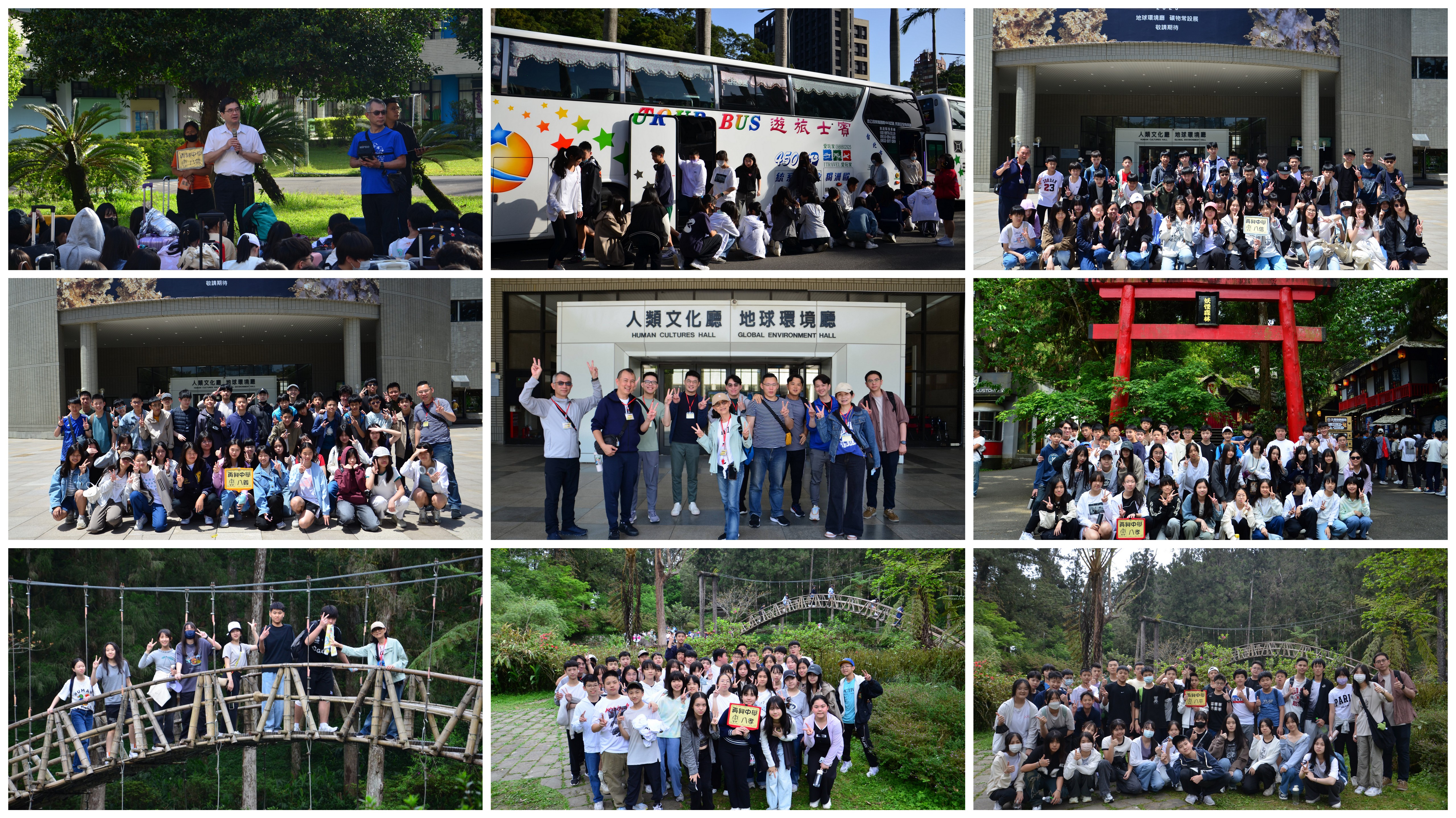 旅行地點主要包括:九族文化村、劍湖山遊樂世界、溪頭自然教育園區及國立自然科學博物館等地。4月16日上午由向主任、八年級各班導師及行政同仁率領下,344位八年級學生滿懷興奮心情踏上旅途。