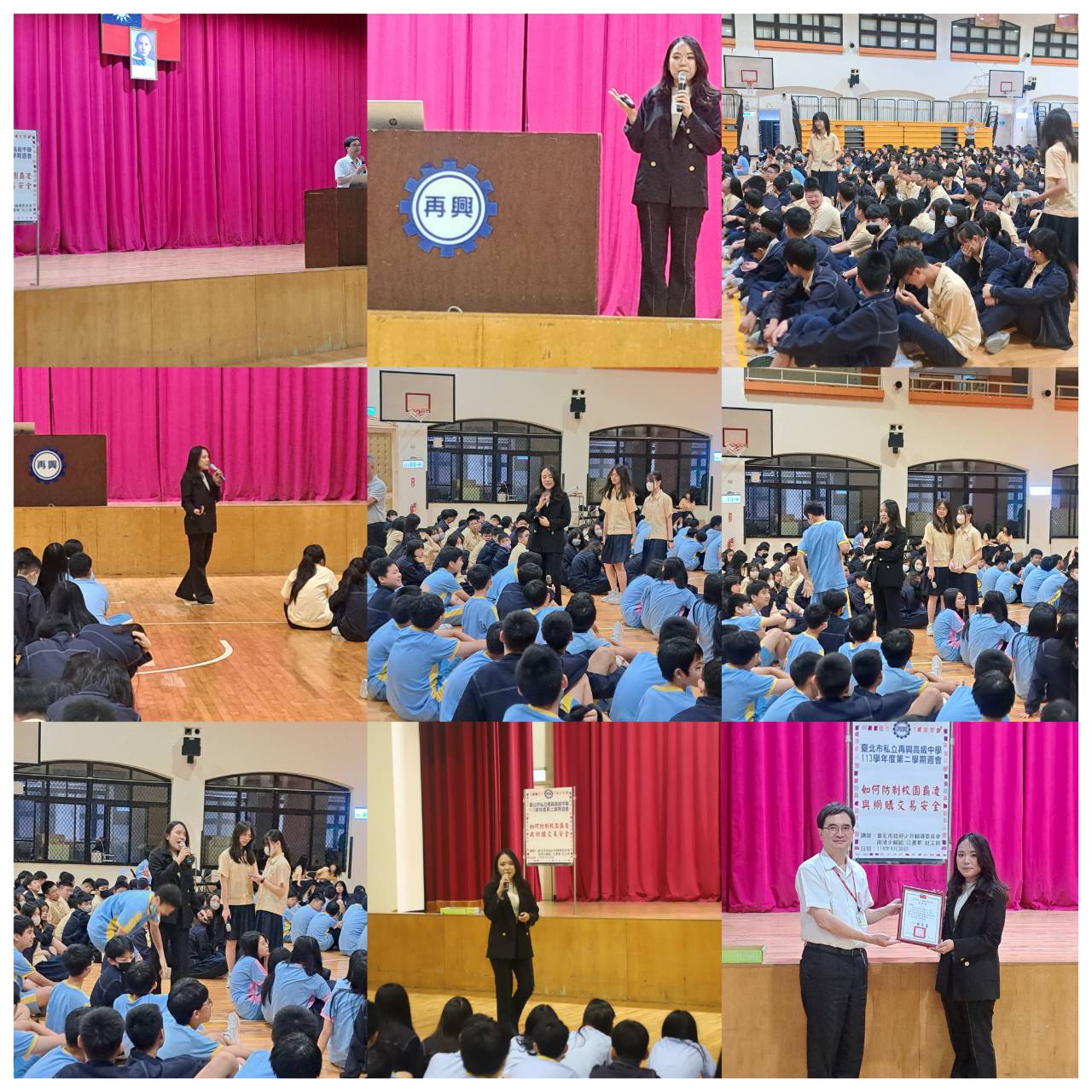 校長率先致詞時,介紹校園可能發生的霸凌種類,發生成因與如何有效避免,並對社會充斥網路購物詐騙,向學生呼籲提醒小心防範。隨後江書華社工師講述各國發生重大霸凌事件,透過台上台下熱情互動致贈各式小禮物隨機提問方式,使學生了解如何應變與面對,最後針對網路購物安全與防範,提出各種成因,以避免因購物不小心,肇致交易安全被侵犯,結束本次講座。
