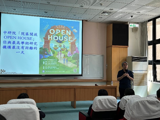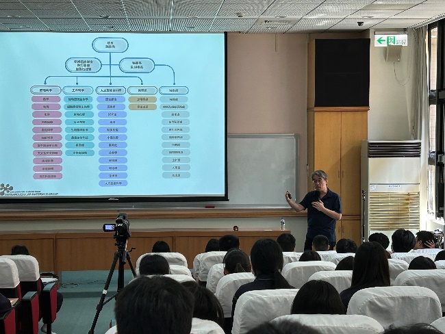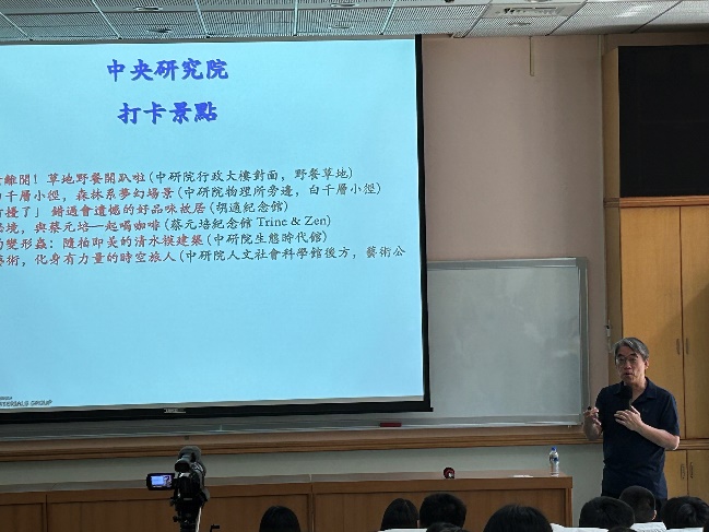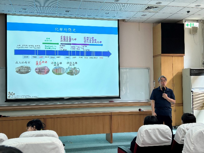 講座一開始,孫教授以簡短的自我介紹揭開序幕,隨即轉入對中央研究院的介紹。他以生動有趣的語言,帶領同學們認識中研院這個國家最高等級的學術研究機構,並分享了該院的熱門打卡景點與年度開放活動「OPEN HOUSE」的豐富內容。透過這樣的引介,不僅讓我們對中研院有了初步認識,也激發了大家對科學研究環境的好奇與憧憬。隨後,孫教授簡要介紹了中研院化學研究所的創立歷程與研究發展方向,讓同學們對該所的學術定位有了更清晰的認識。