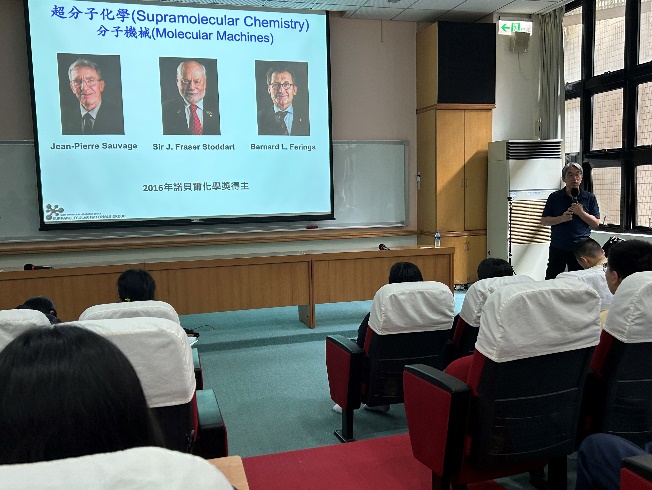 在講解核心理論時,孫教授進一步引入「主客化學」(Host-Guest Chemistry)的概念,並將之作為理解超分子化學的重要基礎。他指出,與傳統化學聚焦於原子與分子內部的共價鍵不同,超分子化學研究的是分子之間藉由非共價鍵(如氫鍵、π-π作用、靜電力等)所形成的複合體,其結構可逆、組裝靈活,因而在材料科學與分子機械領域具有重大突破性。講座中,孫教授特別提到了2016年諾貝爾化學獎得主的研究成果,包括分子馬達、分子電梯與分子跑車等創新裝置,這些都是超分子化學發展的里程碑。他強調,這雖然僅是分子尺度,卻有無限的應用潛能。