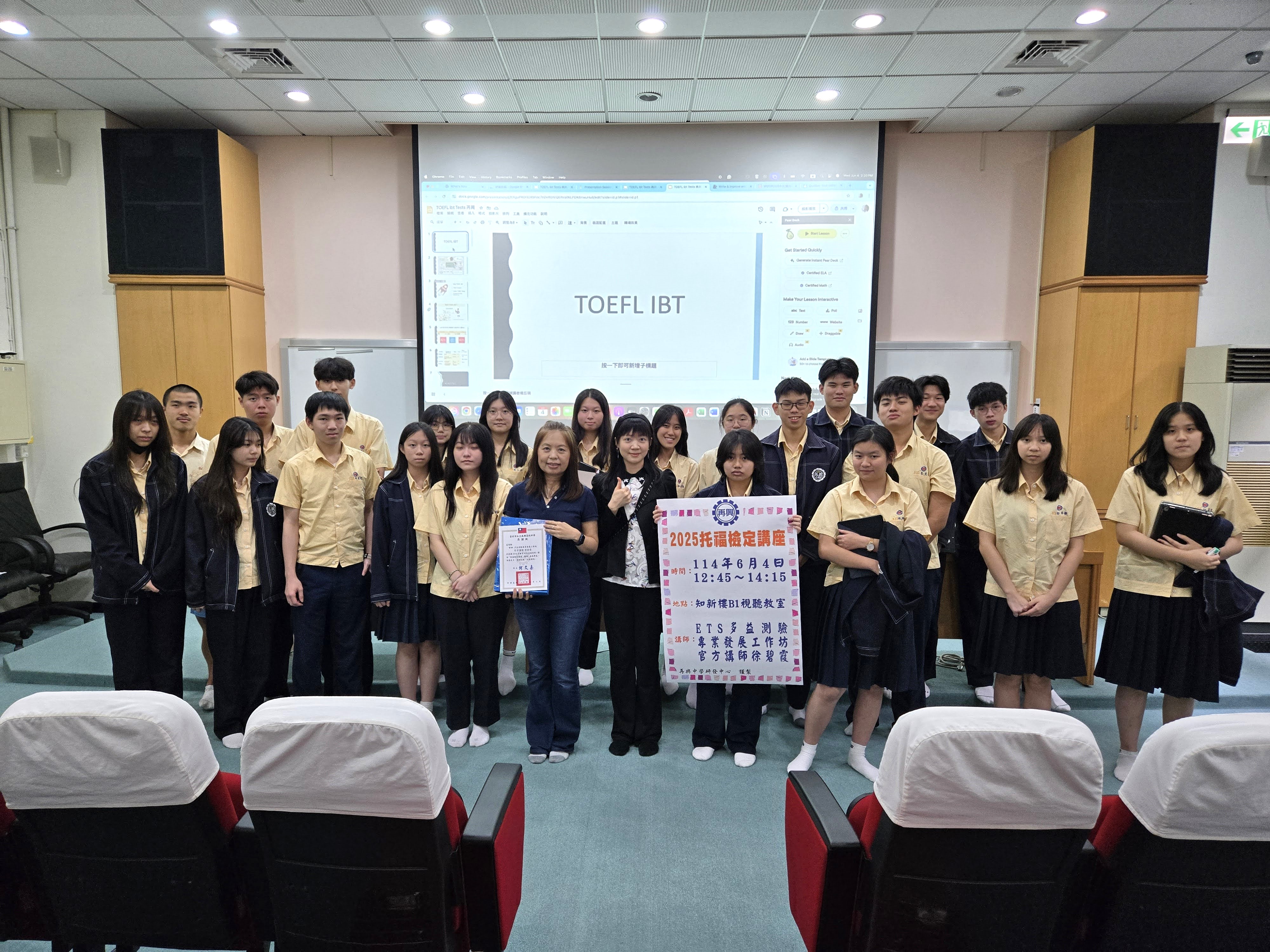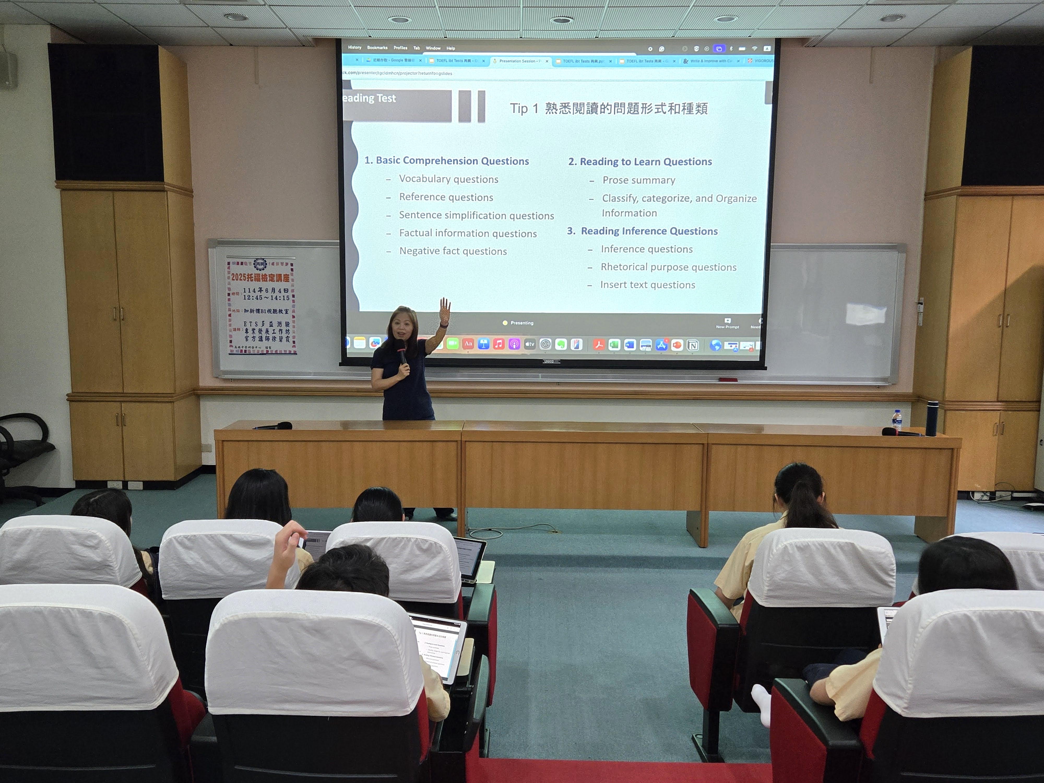 本校於6月4日舉辦「托福檢定講座」,邀請ETS 多益測驗專業發展工作坊官方講師 徐碧霞蒞校主講,協助學生了解托福檢定與準備方向,本場講座共有23位高中部學生報名參加。托福網路測驗(TOEFL iBT)是申請英語系國家大學的重要認證考試,成績獲全球160多國、逾13,000所學術機構認可。講師首先介紹TOEFL iBT 的測驗內容,並透過Pear Deck即時互動教學,引導學生練習範例題,詳盡說明聽說讀寫四大面向的準備要點,學生從問答的互動中掌握答題技巧,收穫豐碩。最後,講師總結托福考試需具備的能力,並分享相關備考資源連結,鼓勵學生持續精進英文學習,累積應考實力。
