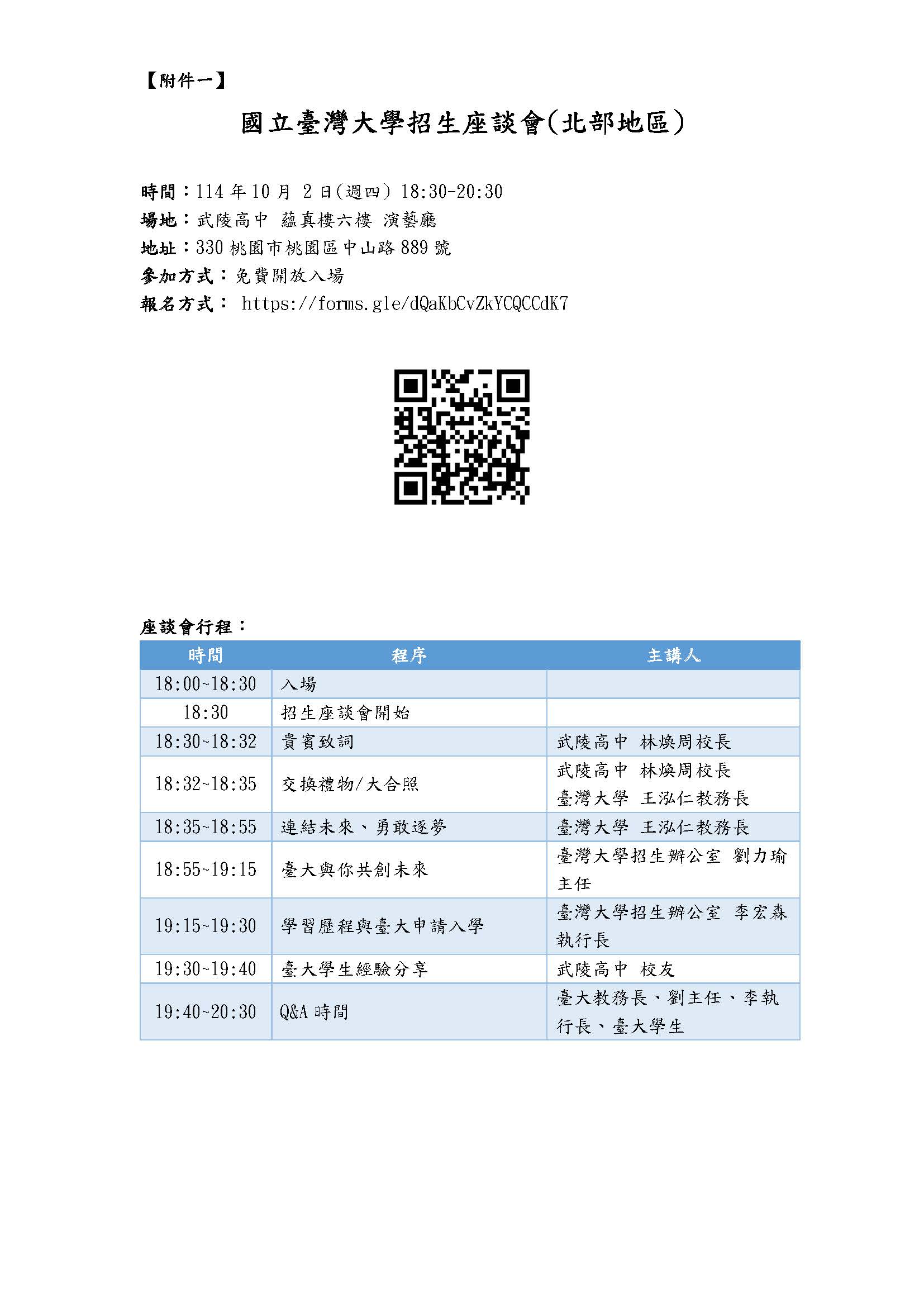 一、為促進高中師生認識臺灣大學特色,鼓勵高中學生以臺灣大學為升學志向,臺灣大學將於桃園舉辦114年招生座談會,時間與地點如下: