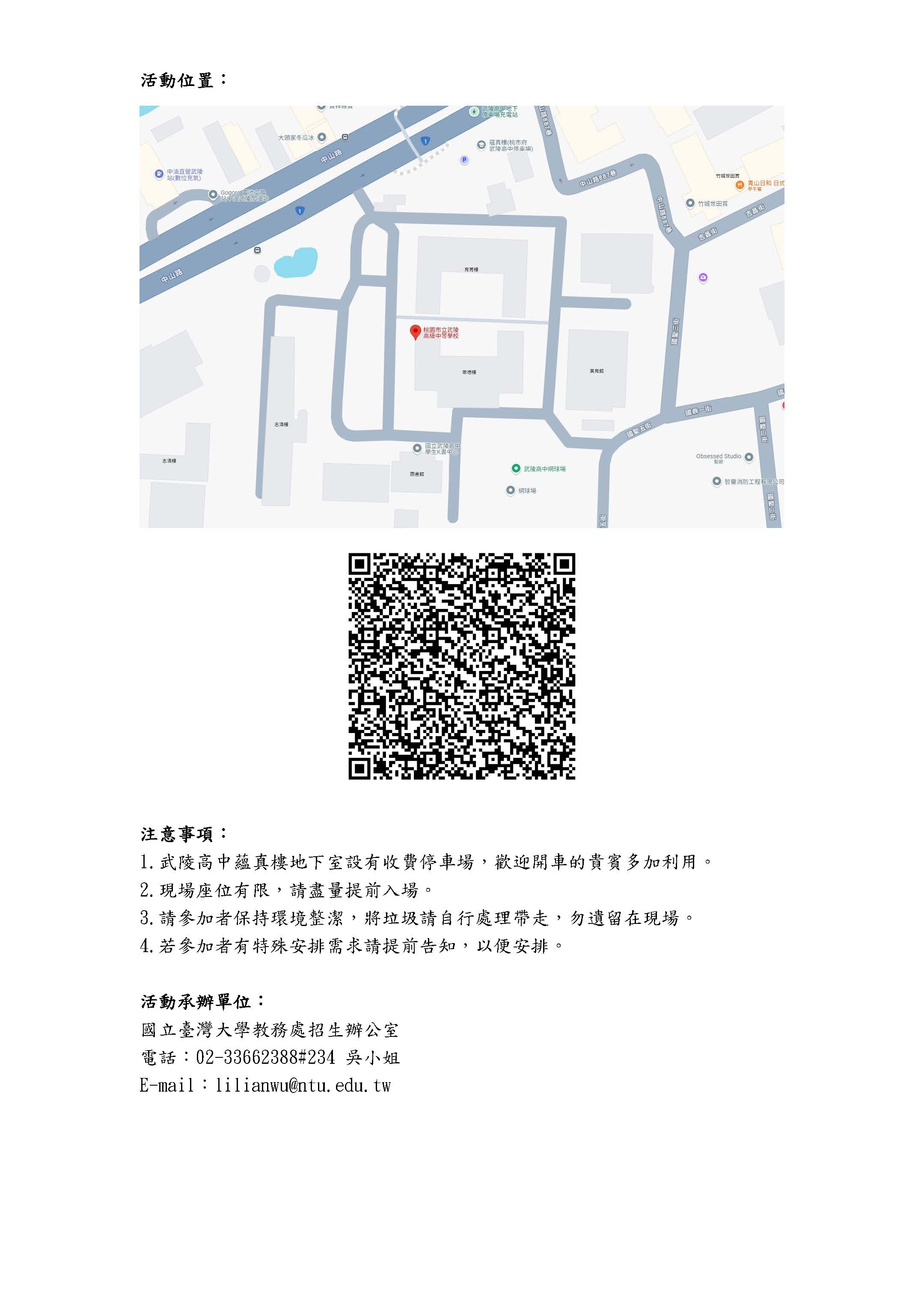 二、若師生對於本場座談會有任何疑問,歡迎洽詢臺灣大學教務處招生辦公室(電話:(02)33662388 ext.234,Email: