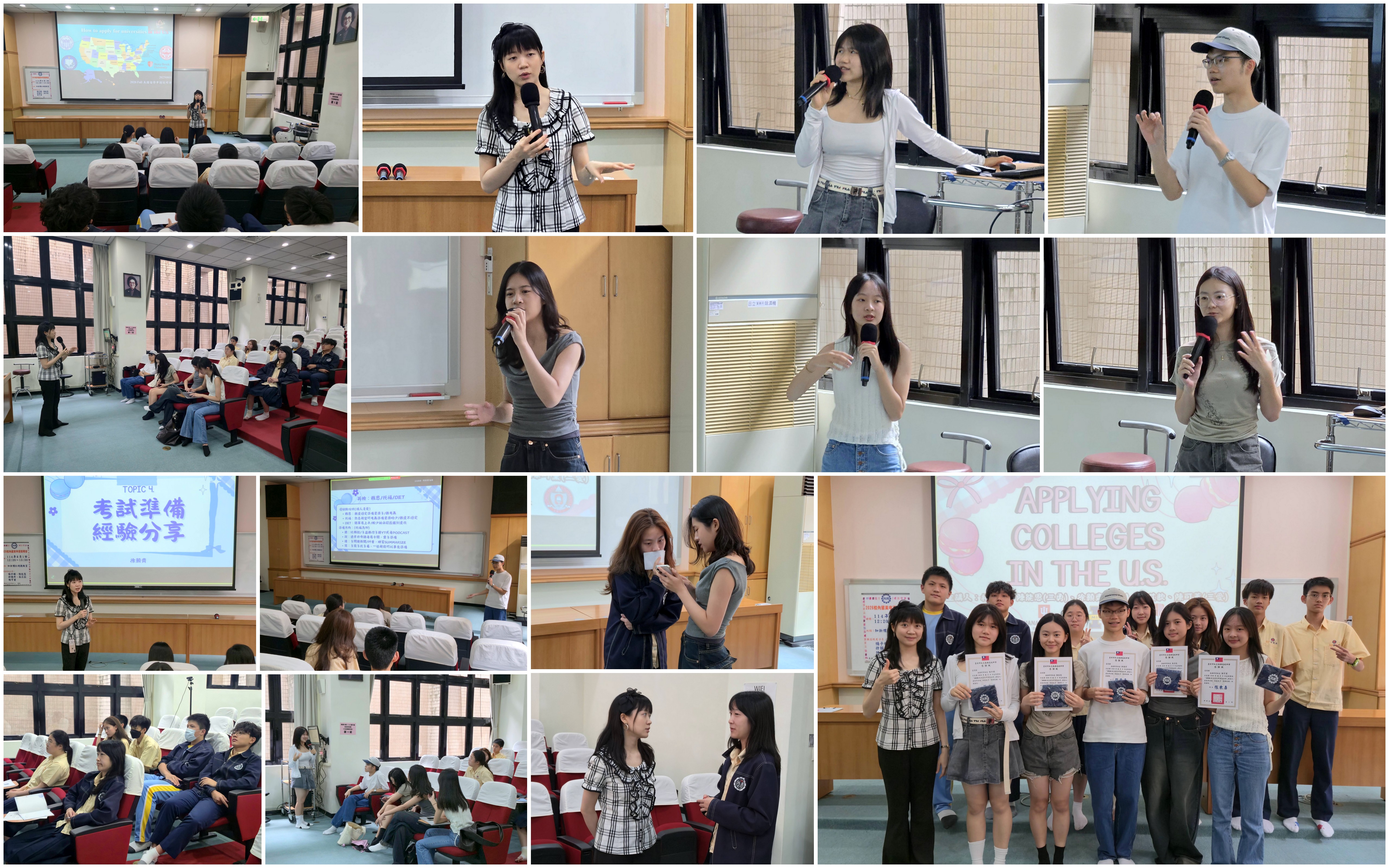 楊子嫻學姊首先說明選校流程,強調應先釐清自身條件與出國規劃,再以大學與科系排名交叉比對,篩選出「自己願意就讀」的學校名單,同時考量錄取機率、學校文化與申請工作量,做出最適合自己的選擇。徐顥齊學長則提醒同學善用高中階段的成績與經歷,發掘自身可延伸的亮點來展現熱情與影響力,並分享SAT與英檢備考策略與資源平台。張苡歆學姊則分享申請資料填寫時的關鍵技巧,並強調內容要展現真實自我。陳可薰與陳能恩學姊進一步傳授自傳的寫作技巧,並提醒在使用AI工具輔助時,務必保持內容的原創性與誠信。會後學妹踴躍發問,詢問有關留學代辦的選擇等,學長姊們都提出寶貴的見解,讓後輩們收穫滿載。最後大家一起留下珍貴合影,為這場充實且溫馨的說明會畫下圓滿句點。希望透過本次說明會,協助同學更有方向地展開留學準備,在申請之路上邁出堅定的第一步。