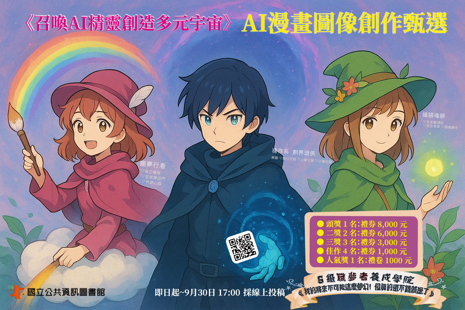 該館為鼓勵青少年活用AI技巧、發揮個人創意,以「我的未來職業想像」為主題,鼓勵14至22歲(民國92至100年出生)青少年以生成式AI出圖後進行後製編修。揭活動採網路投稿(活動網址:https://nlpi.pse.is/7nahqm),投稿時間自即日起至114年9月30日(星期二)下午5時止。