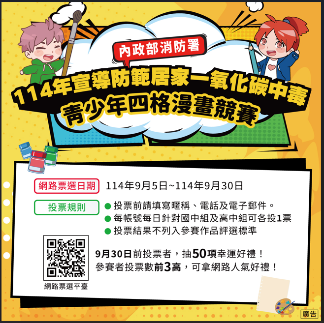 說明:一、依據本府消防局114年9月11日北市消預字第1143042150號函辦理。二、旨揭票選活動期限自即日起至114年9月30日止,請協助宣導並鼓勵學生踴躍投票。