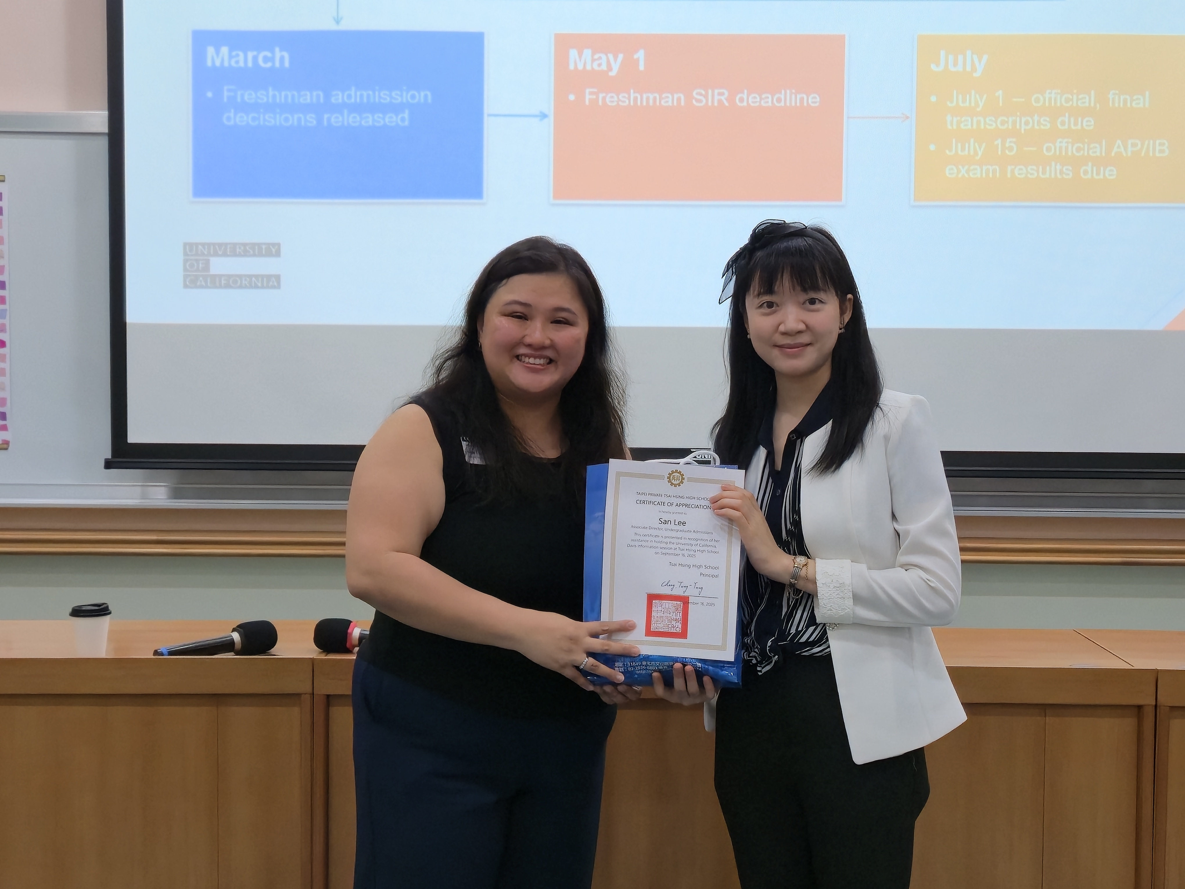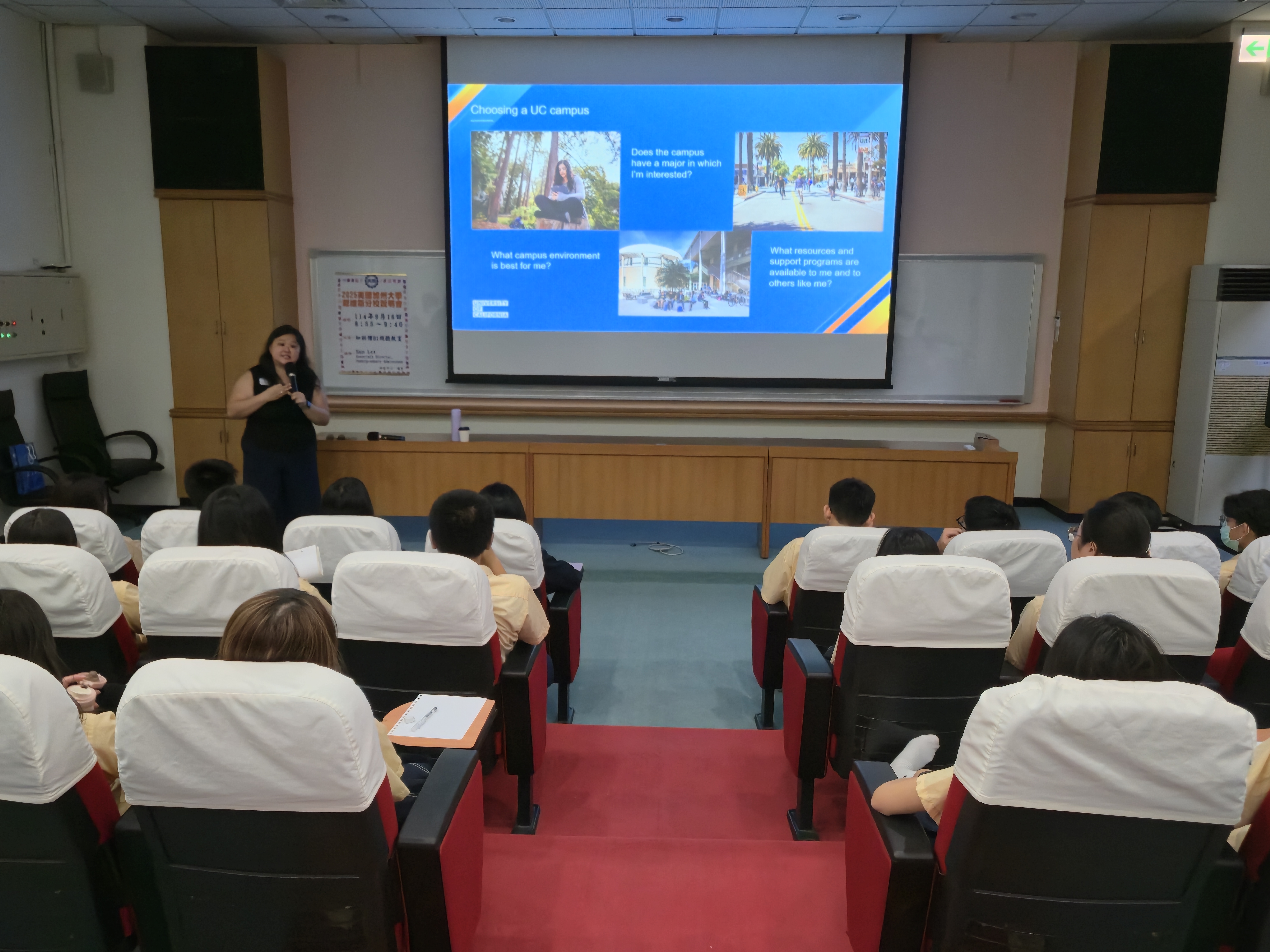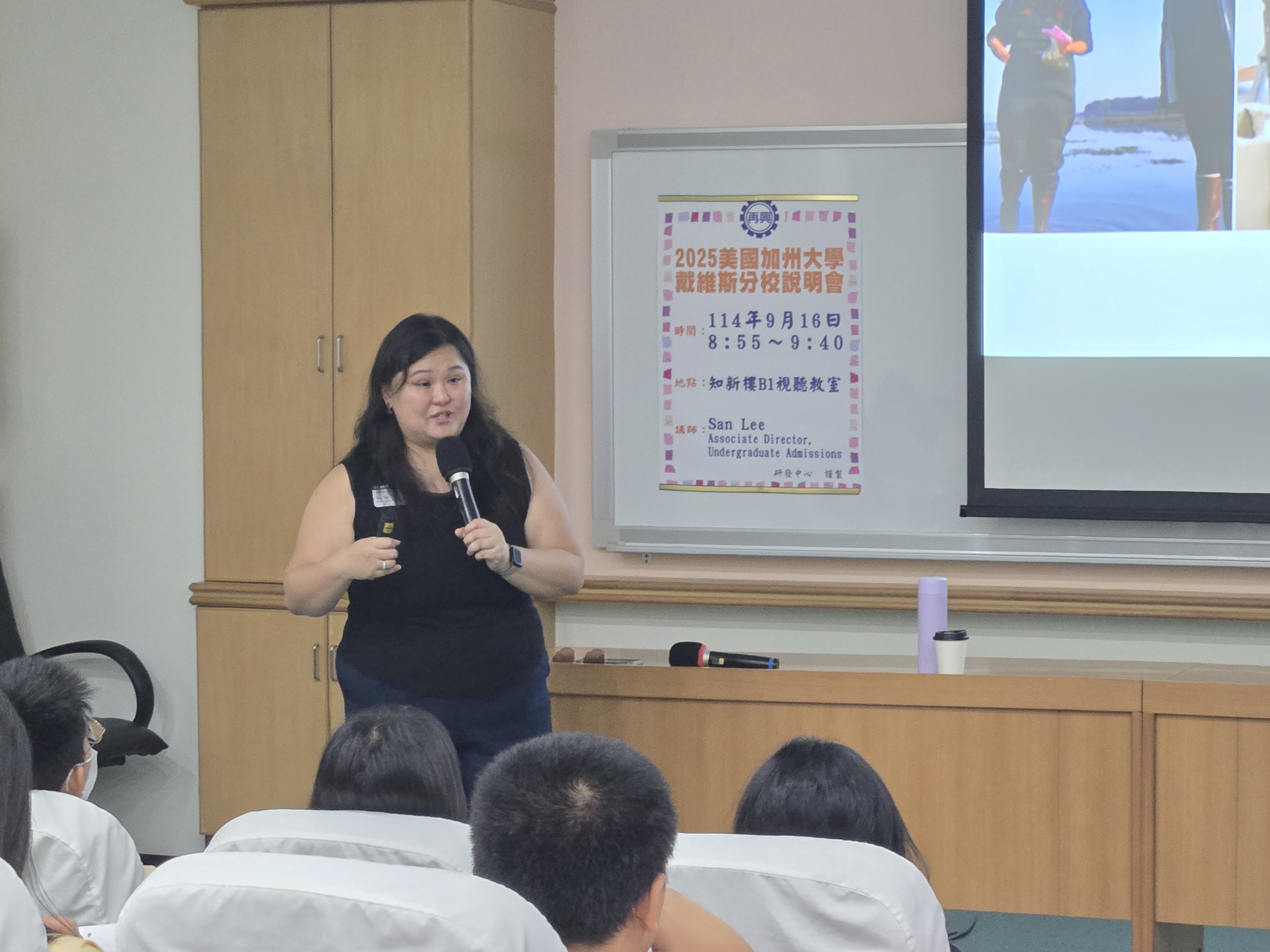 本校9月16日舉辦美國加州大學戴維斯分校說明會,邀請國際招生部副主任San Lee介紹校園與申請流程。本場說明會共有33位高中部學生參加,內容分為四個部分: 校園位置與環境、學院系所介紹、加州大學申請系統與申請時程,以及學生提問時間。
