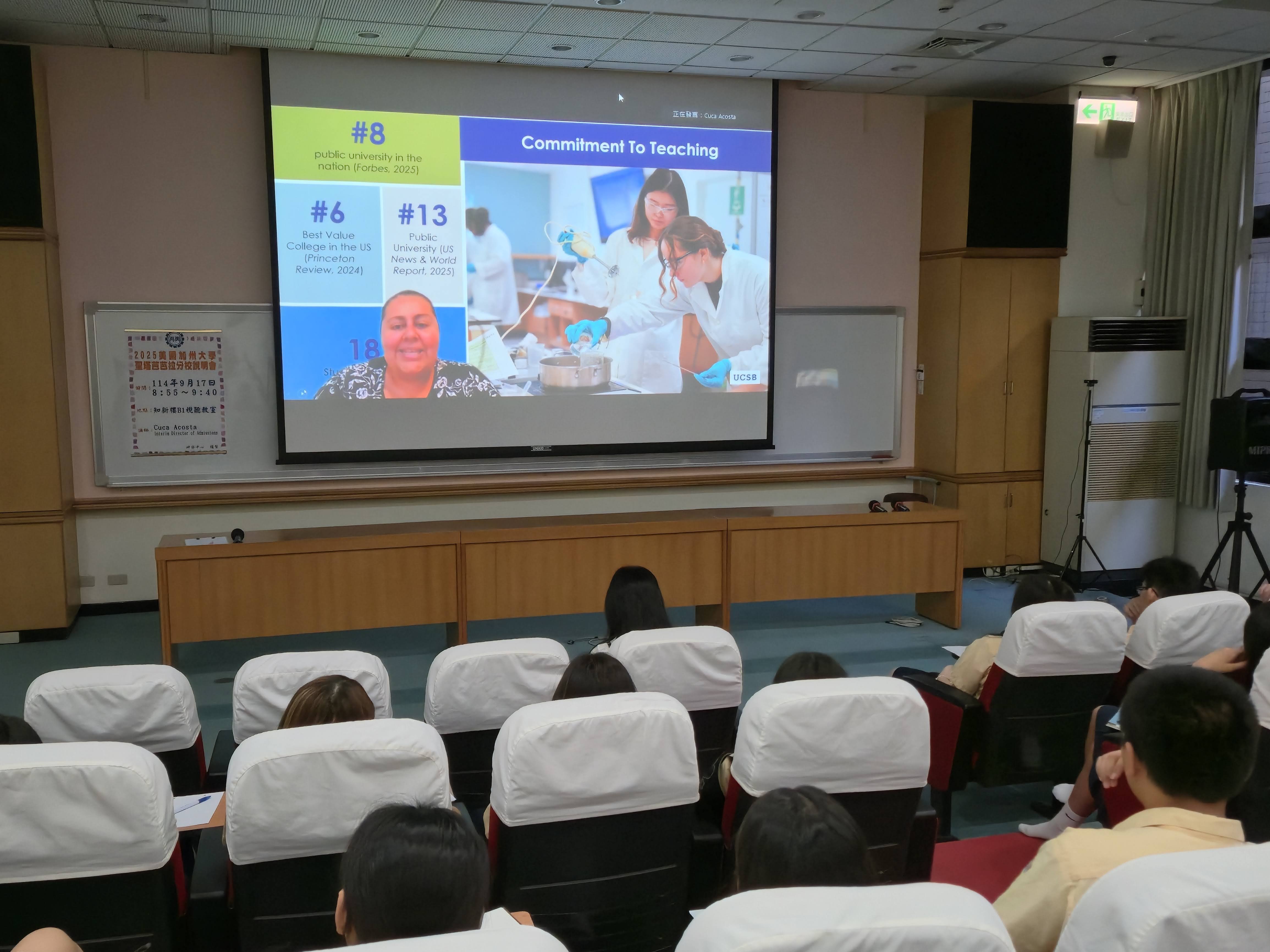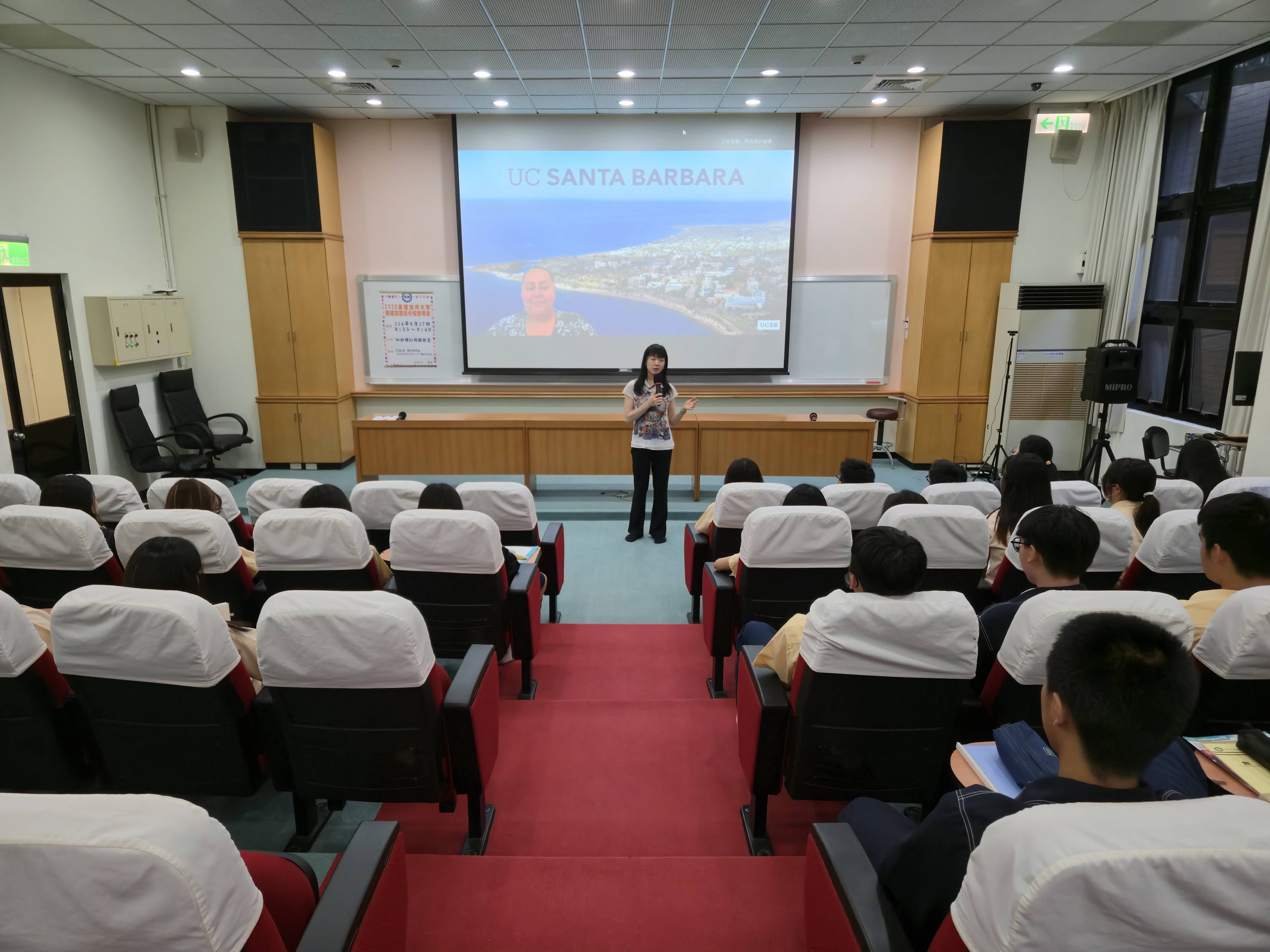 本校9月17日舉辦美國加州大學聖塔芭芭拉分校說明會,邀請國際招生部主任Cuca Acosta介紹校園與申請流程。本場說明會共有34位高中部學生參加,內容分為四個部分: 校園位置與環境、入學條件與申請時程、學院系所介紹,以及學生提問時間。