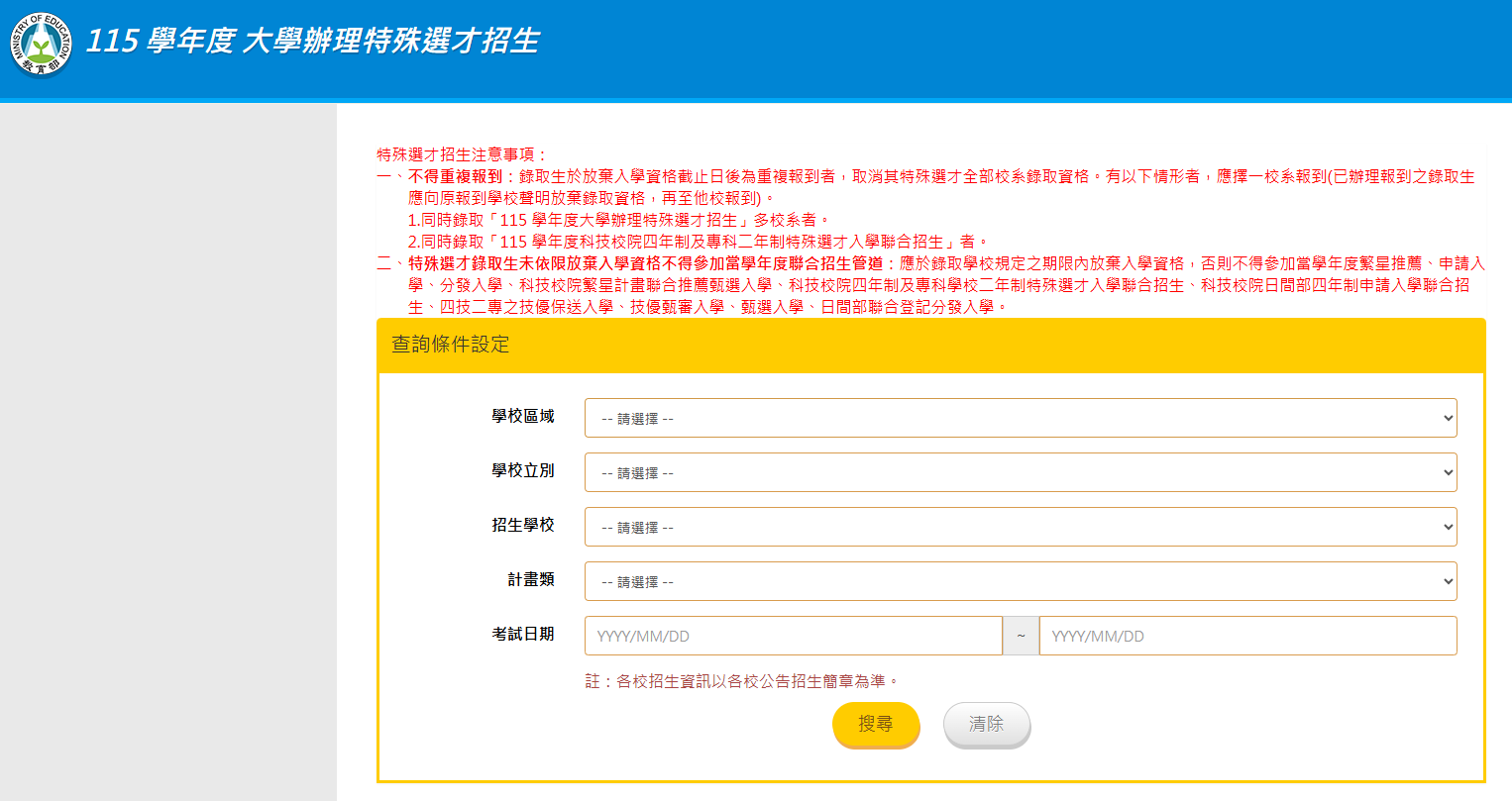 四、115學年度大學辦理特殊選才招生網址 https://srecruit.moe.edu.tw/