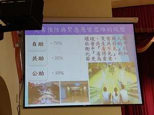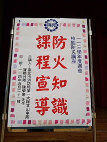 教育部推動校園防災政策,目標係從思維概念著手,透過教育宣導,使防災觀念從小扎根,建立正確的認知,培養正面積極的災害管理態度,強化災害應變能力。本校每學期透過定期辦理防災知識宣導、逃生演練、滅火器使用與CPR+AED要領示範,強化師生情境思考、危機處理與災害心理,落實防災教育。