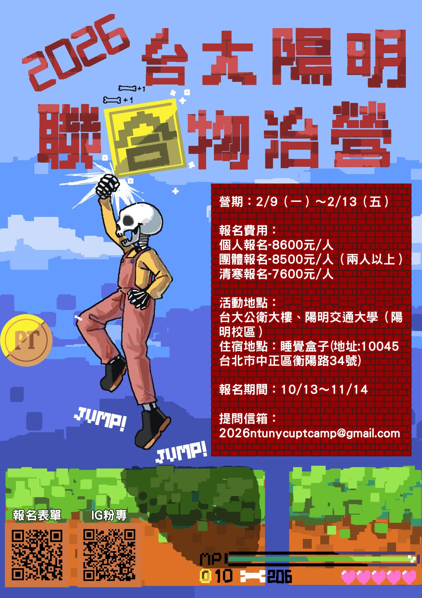 【營隊訊息】國立陽明交通大學辦理「2026臺大陽明交大聯合物治營」 國立陽明交通大學 函 主旨:檢送「2026臺大陽明交大聯合物治營」活動海報,敬請惠予協助公告宣傳,並鼓勵同學報名參與。 說明: 一、本研習營係以推廣物理治療等內容領域為目的,並協助高中生確立其生涯志向,歷年來活動成效深獲社會各界及全國高中生之肯定。 二、本研習營相關訊息如下: (一)營隊時間:115年2月9日至2月13日,共5天4夜。 (二)報名截止日:114年11月14日。 (三)活動地點:國立陽明交通大學(陽明校區)、國立臺灣大學校區(公館校區、公衛大樓)。 (四)營隊詳情及報名資訊請上陽明交通大學課外活動輔導組網站查詢(https://osa.nycu.edu.tw/osa/ch/app/artwebsite/view?module=artwebsite&id=…)→寒暑期營隊資訊查詢;或洽本校課外活動輔導一組,電話(02)2820-3701。