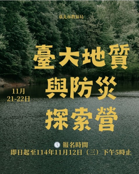 臺北市114學年度公私立高級中等學校「臺大地質與防災探索營」 說明: 一、依本局高級中等以下學校「防災教育中程實施計畫」辦理。 二、藉由與國內大學合作辦理營隊,讓學生瞭解防災知識,親身體驗防災措施與應變機制,深化高中學生防災意識,特辦理旨揭計畫。 三、辦理方式:同日辦理2場次不同主題之營隊,各場次第1天全天進行野外實察教學,第2天上午進行室內專業課程講授。 四、辦理時間:114 年 11月21日(五)全天~ 11月22日(六)上午。 五、辦理地點: (一)第1場次:宜蘭地區、國立臺灣大學。 (二)第2場次:大臺北地區、國立臺灣大學。 六、參加對象:以本市公私立高級中等學校學生(年滿15歲以上)為主,每場次30名,共2場次。 七、費用:全程免費。 八、報名方式: (一)自即日起至114年11月12日(三)下午5時止,填妥報名資料寄送臺北市立萬芳高級中學。 (二)報名學生請填寫營隊報名表(如附件2),繳交至就讀學校承辦窗口,經核章彙整後於11月12日(三)下午5時前,以聯絡箱(240)或郵寄方式送至臺北市立萬芳高級中學(臺北市文山區116興隆路三段115巷1號,教官室收),始完成報名程序。 九、錄取名單預計於11月17日(一)前,公告於臺北市立萬芳高級中學網站首頁。 十、請各校核予錄取學生公假登記,以利參加探索營活動。 十一、聯絡窗口:萬芳高中賴主任教官(02-22309585#430)。
