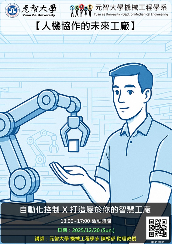 元智大學「自動化控制 X 打造屬於你的智慧工廠」營隊教學活動 【說明】: 營隊假本校三館辧理,活動採網路報名,活動簡章請至報名網址(https://pse.is/89s7ks)查詢。 【招生對象】全國高中職學生。 【活動日期】 2024/12/20(六) 13:00~17:00 【活動地點】桃園市中壢區遠東路135號元智大學3館3樓3305教室。 【人數上限】15名,請提早完成報名。 【報名期間】即日起至114年12月8日止,或額滿為止。 【活動費用】新台幣 800 元 /人 (含保險) 5 人以上團體報名優惠:700 元 /人; 低收入戶:700 元/人(請附巿政府核定之證明,傳真至03-4558013)。 【繳費期間】即日起至114年12月8日止,請透過轉帳方式繳交。 戶名:財團法人元智大學 銀行:遠東國際商業銀行(銀行代碼805)桃園分行 帳號:004-001-00015941 【退費規定】活動前1日申請退費者,恕不予退款。 【聯絡資訊】元智大學機械工程學系郭秋明小姐 聯絡電話:(03)4638800分機2452 email:hocmkuo@saturn.yzu.edu.tw