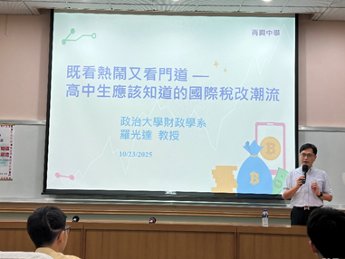 10月23號下午,政大財政學系羅光達教授蒞校分享「國際租稅改革潮流」。羅教授同時擔任政大社科院副院長、中華財政學會監事,亦主持多項政府主導之政策相關研究。在演講當中,教授幫助我們認識國際稅制發展的歷程,含括原先稅制的缺陷、改革的過程,到未來的發展趨勢。