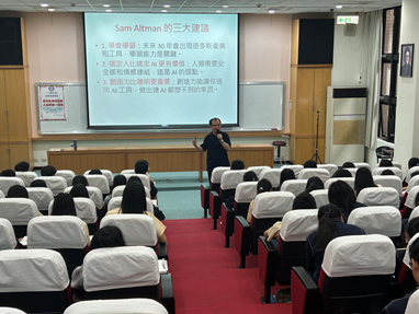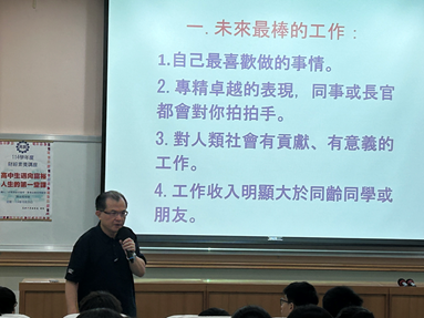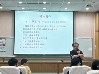 高中生邁向富裕人生的第一課 高一勇班 陳若水 蔡湘儀 報導 10月30日邀請到富邦銀行陳永裕先生進行專題演講,主題是「高中生邁向富裕人生的第一課」,分享未來工作選擇及基本理財知識。 未來最棒工作 如何不被AI取代 Sam Altman的三大建議 : 高中生基本理財知識 心得