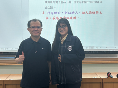 這場演講雖然只有短短兩節課,但陳老師與同學們分享了許多不同面向的主題。從能創造收入的工作選擇,到能運用收入的理財知識,使同學能從不同角度切入。相信每位同學都獲益良多,能利用這些所學邁向富裕人生。