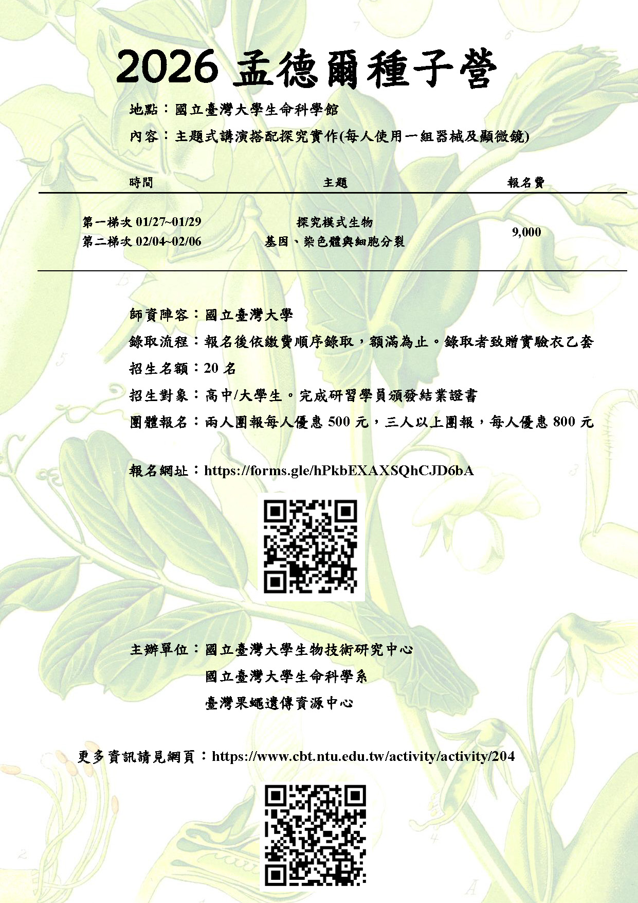 說明: 一、營隊主題:探究模式生物基因、染色體、細胞分裂與實作,以主題式講演搭配探究實作 (每人使用1組器械及顯微鏡)。 二、營隊時間如下:第1梯次為115年1月27至29日。第2梯次為115年2月4至6日。 三、營隊地點:本校生命科學館。 四、活動對象:歡迎具備高中基礎生物知識之學員參加。 五、相關細節及報名方式請至以下網頁:https://www.cbt.ntu.edu.tw/activity/activity/204。國立臺灣大學「2026 孟德爾冬季種子營」