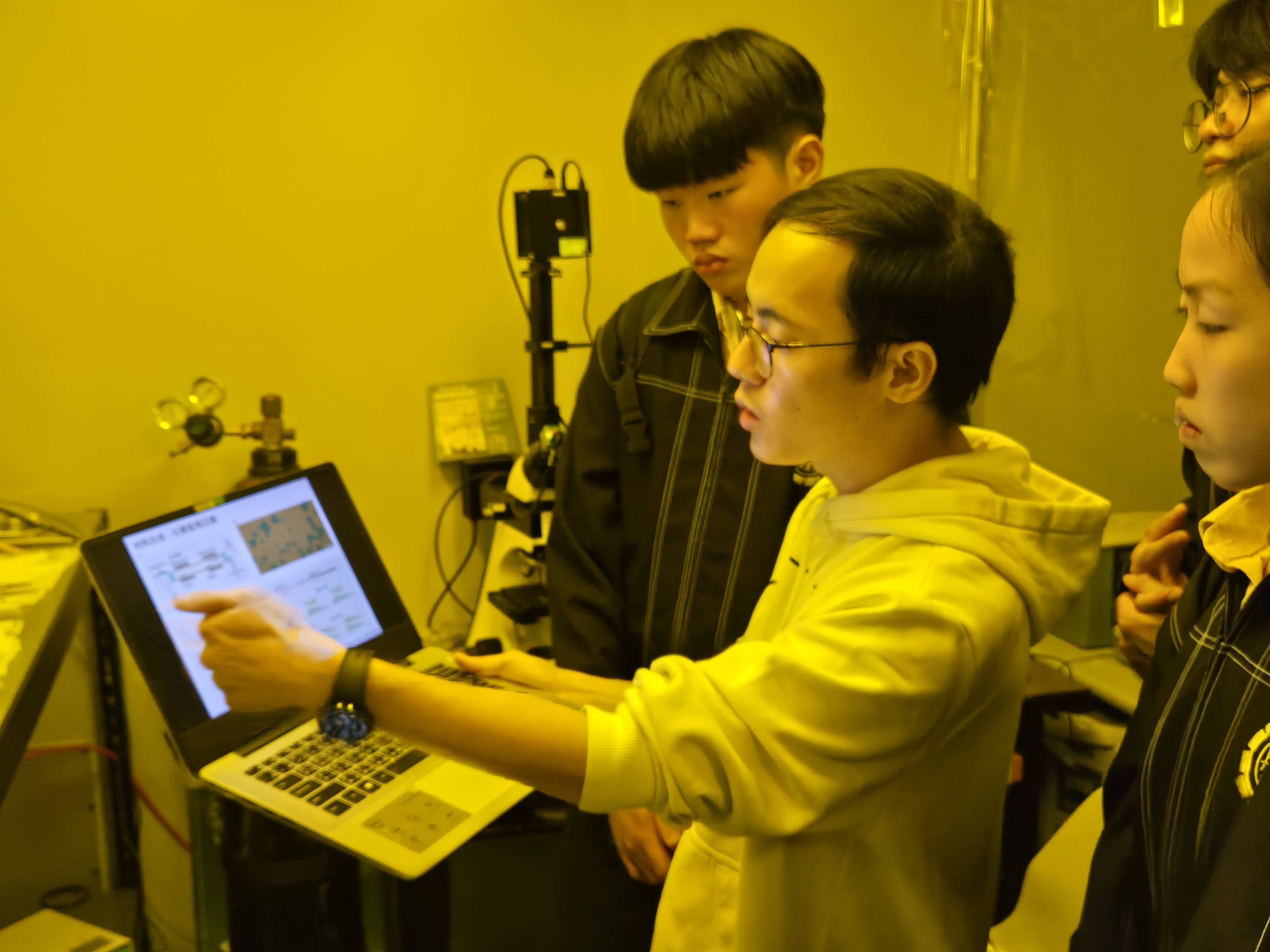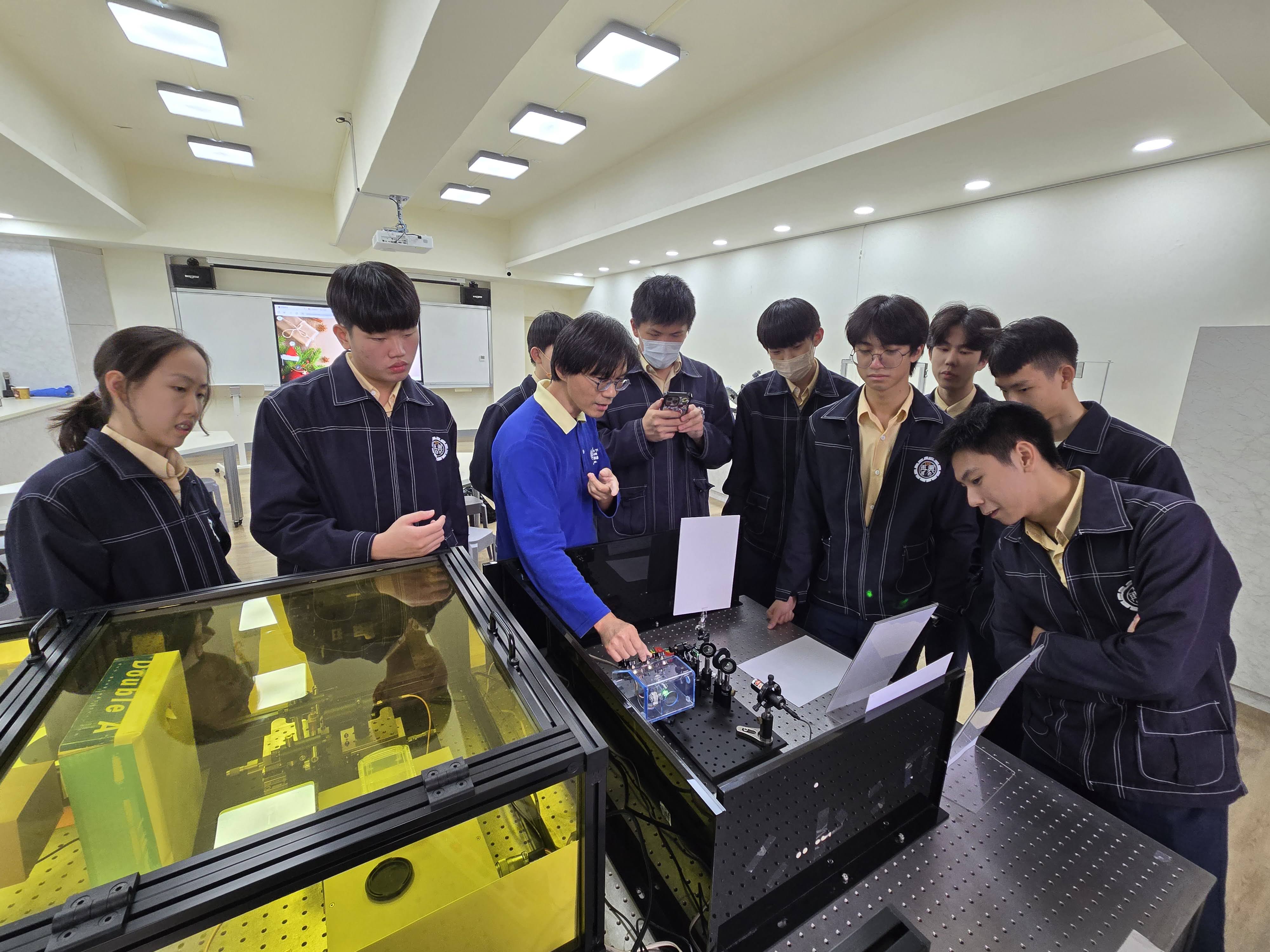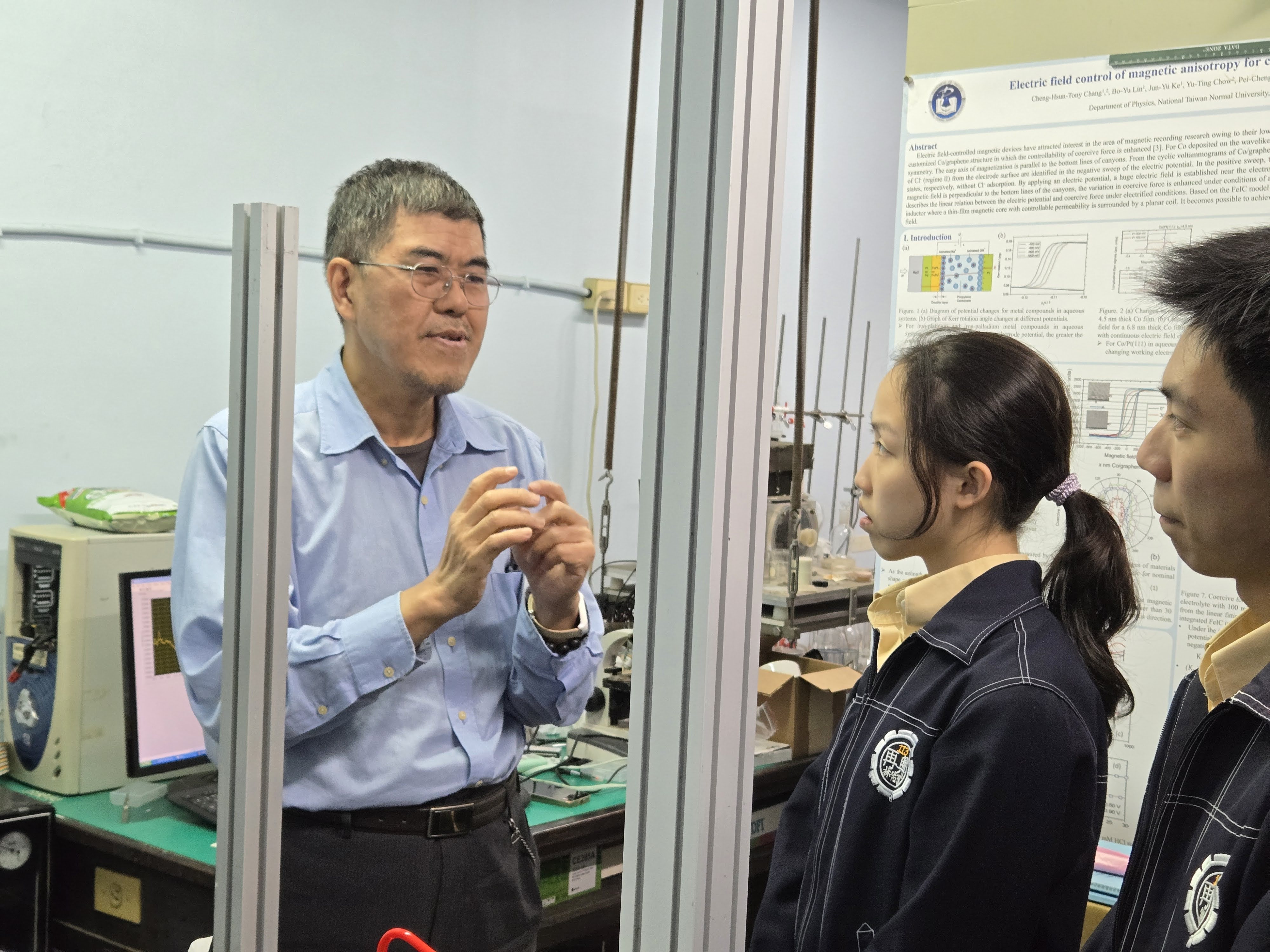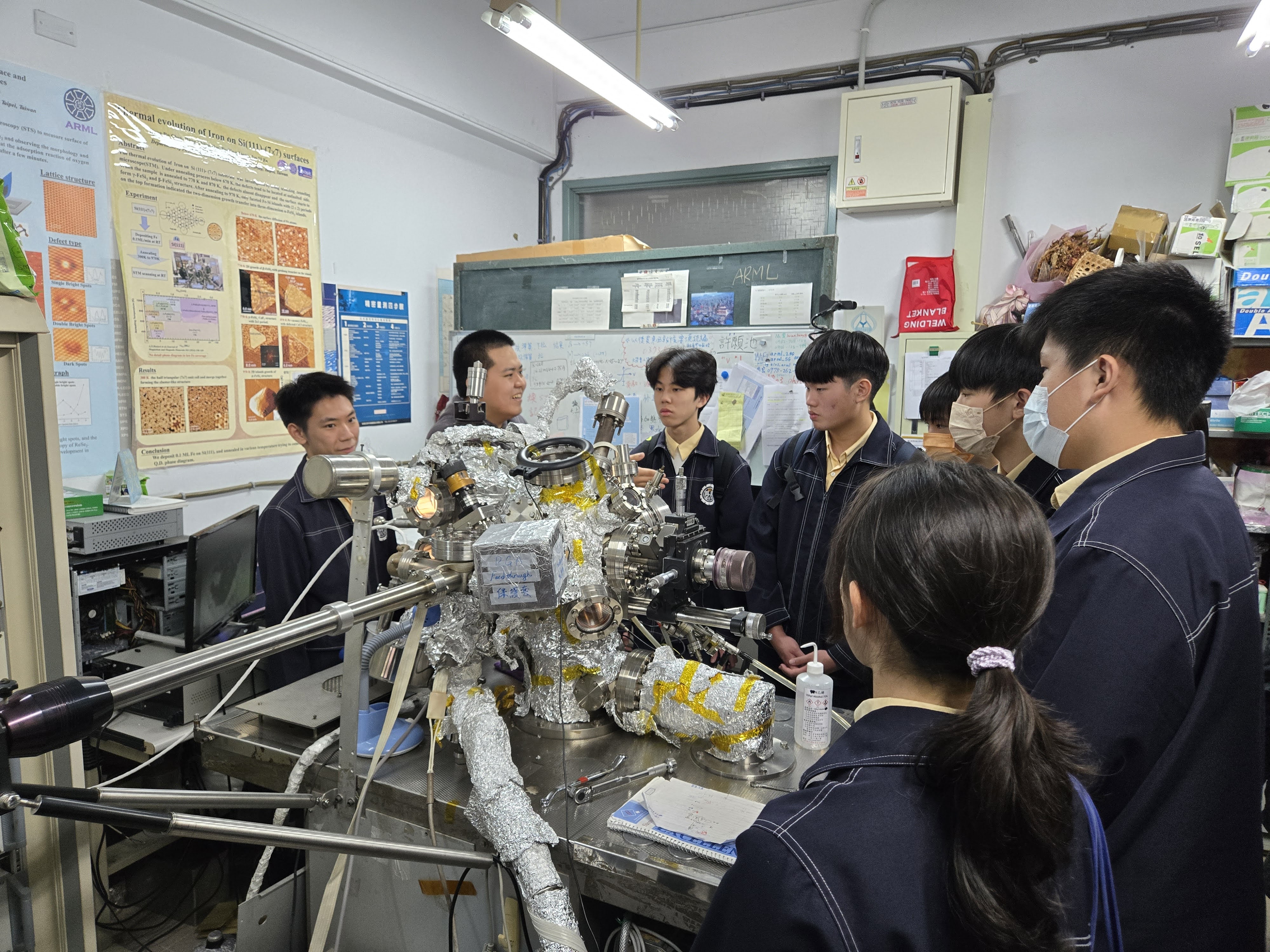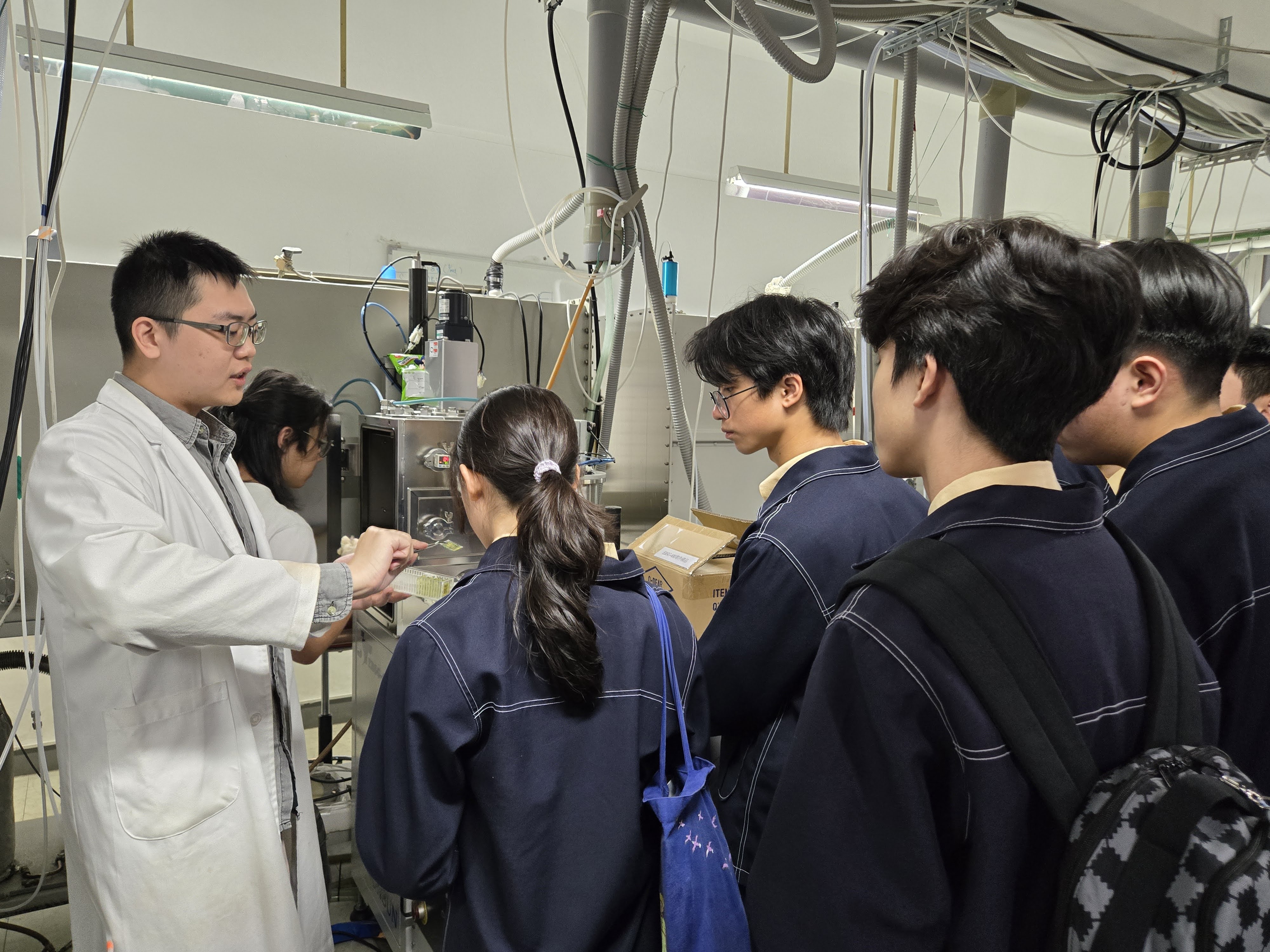 歡迎會結束後,展開物理系的參訪行程,首先,師生進入蔡志申教授的奈米磁學實驗室,由蔡教授親自解說多種先進實驗器具,包括掃描式穿隧顯微鏡與核磁共振儀。接著,傅祖怡教授帶領大家參觀原子解析顯微鏡術實驗室,並示範「掃描穿隧顯微鏡(STM)」的運作原理,研究生們也詳盡導覽其用途與操用方式,令師生印象深刻。隨後,師生走訪趙宇強教授的光電材料暨元件實驗室,認識熱蒸鍍機、半導體製程設備與四點探針電阻量測器。接著參觀藍彥文教授的功用黃光室,觀摩化學氣象沉積設備與LED曝光微影設備。最後一站來到近年翻新的富秋物理示範實驗室,由徐源宏助教展示多項物理儀器,包括文氏管(伯努力定律)、牛頓擺、陀螺儀角動量守恆(車輪及旋轉椅)、振動平板、伽利略溫度計、雷射振鏡(利薩如圖形)等。新穎的互動儀器與學習空間,讓學生們在開心探索之餘,收穫寶貴的知識。 參訪尾聲,師生們齊聚理學院前合影留念,衷心感謝臺師大物理系每年提供實驗室參訪的機會,不僅培養學子們科學思辨的精神,也鼓勵未來有志者加入臺師大物理系深造。學生參訪後寫下心得,表示對奈米課程有了更深入的認識,也對自己未來的學術道路有了更清晰的願景。 114-1204奈米科技師生參訪臺師大實驗室 活動報導