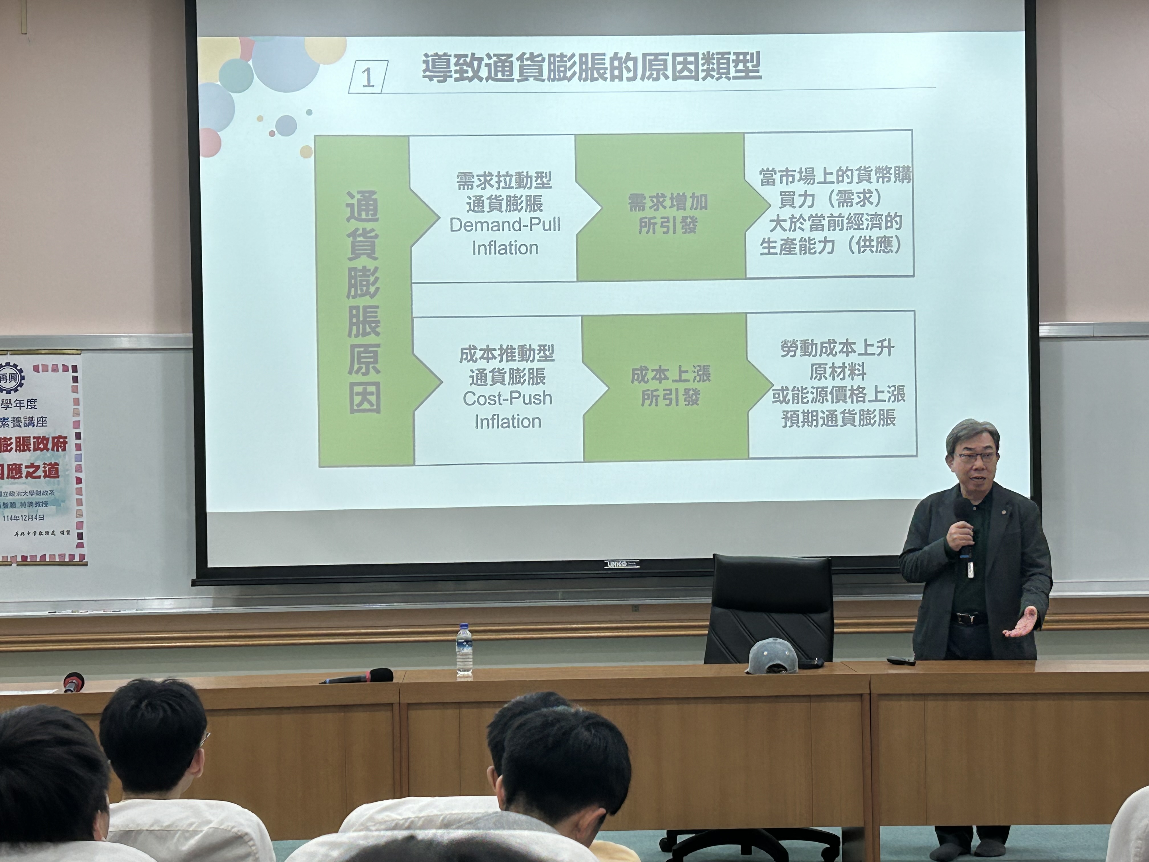 本次的專題演講中,教授透過幽默風趣的口吻向我們分享了關於通貨膨脹的大小事,其中也融入了許多教授的親身經歷及教授對於通貨膨脹的看法。在講座進行的過程中,教授還暫時跳脫了「通貨膨脹」的主題補充了稅收和投資,更提升我們對於財經知識的能見度。在這次的講座中,相信各位同學也對「通貨膨脹」有了更全面的認識!