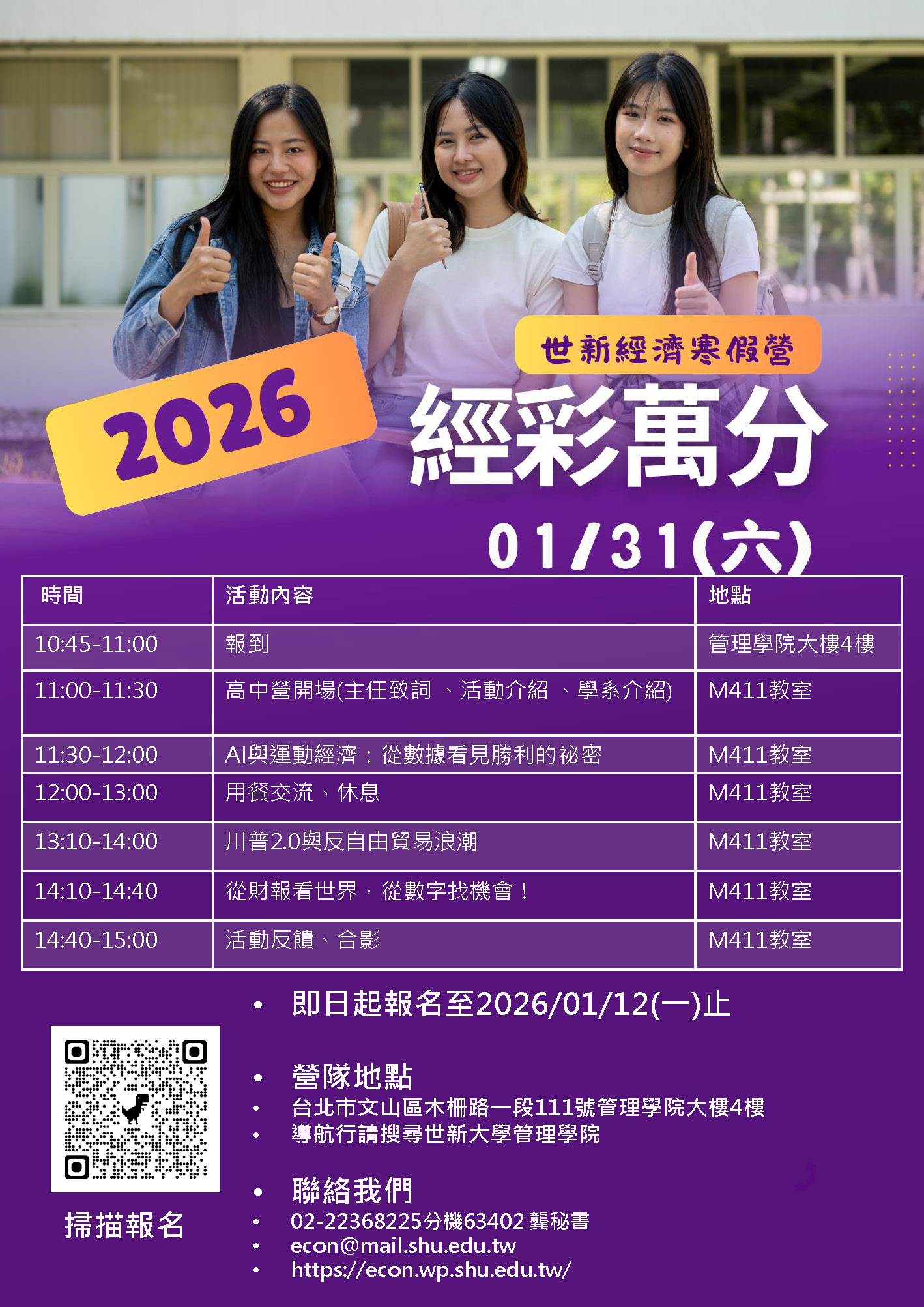 說明: 一、因報名踴躍課程仍持續開放報名中。名額有限,請欲參加者把握機會,亦請惠予協助公告並轉知學生及家長周知。 一、活動時間:115年1月31日(星期六)10時45分至15時。 二、活動地點:本校管理學院大樓4樓M411教室(臺北市文山區木柵路一段111號)。 三、參與對象:全國高中職生(活動全程免費)。 四、報名自即日起至115年1月12日(星期一)止。相關公告可至本校經濟學系系網(https://econ.wp.shu.edu.tw/)查詢。 世新大學「2026世新大學經濟營《經彩萬分》」