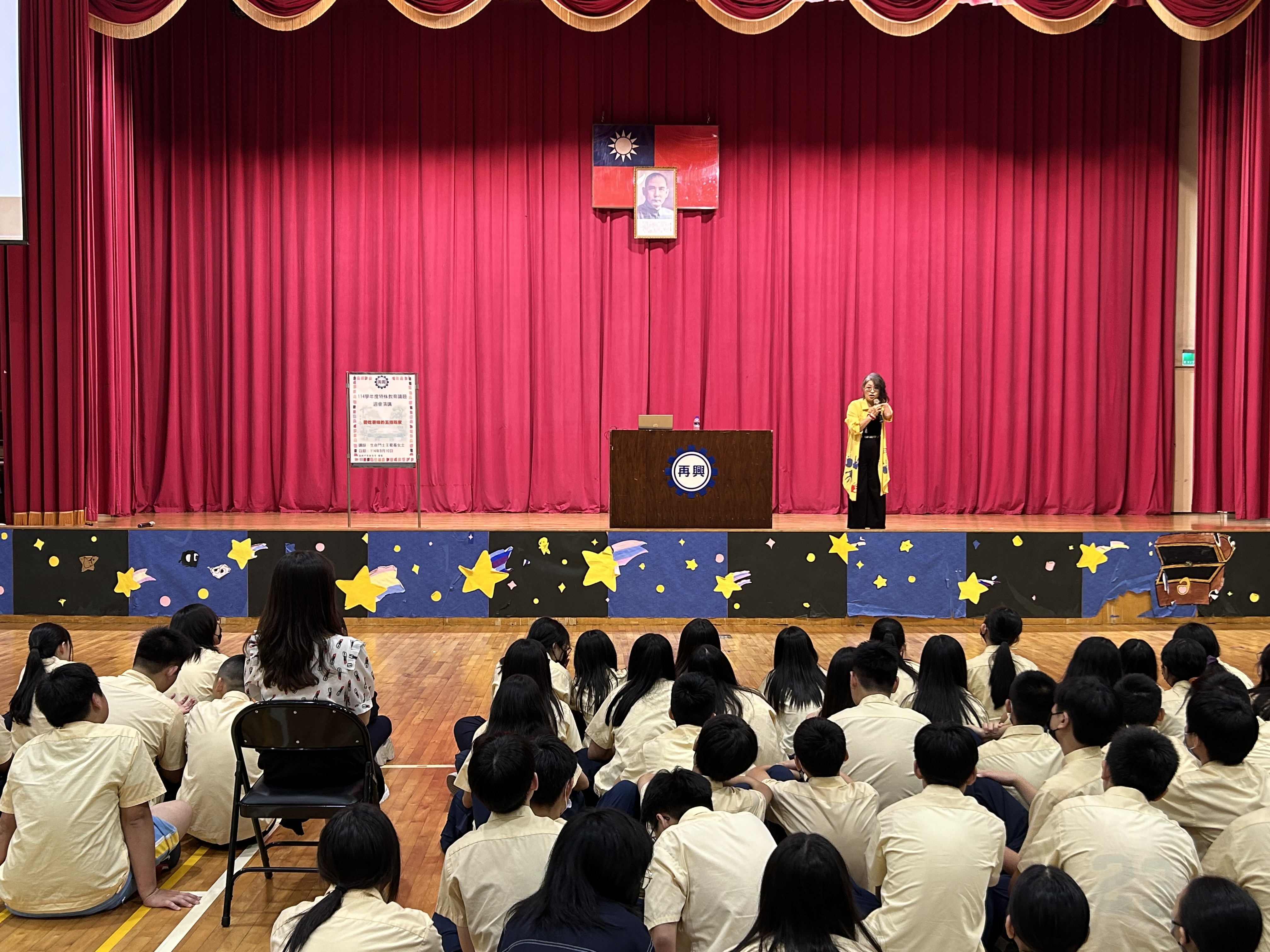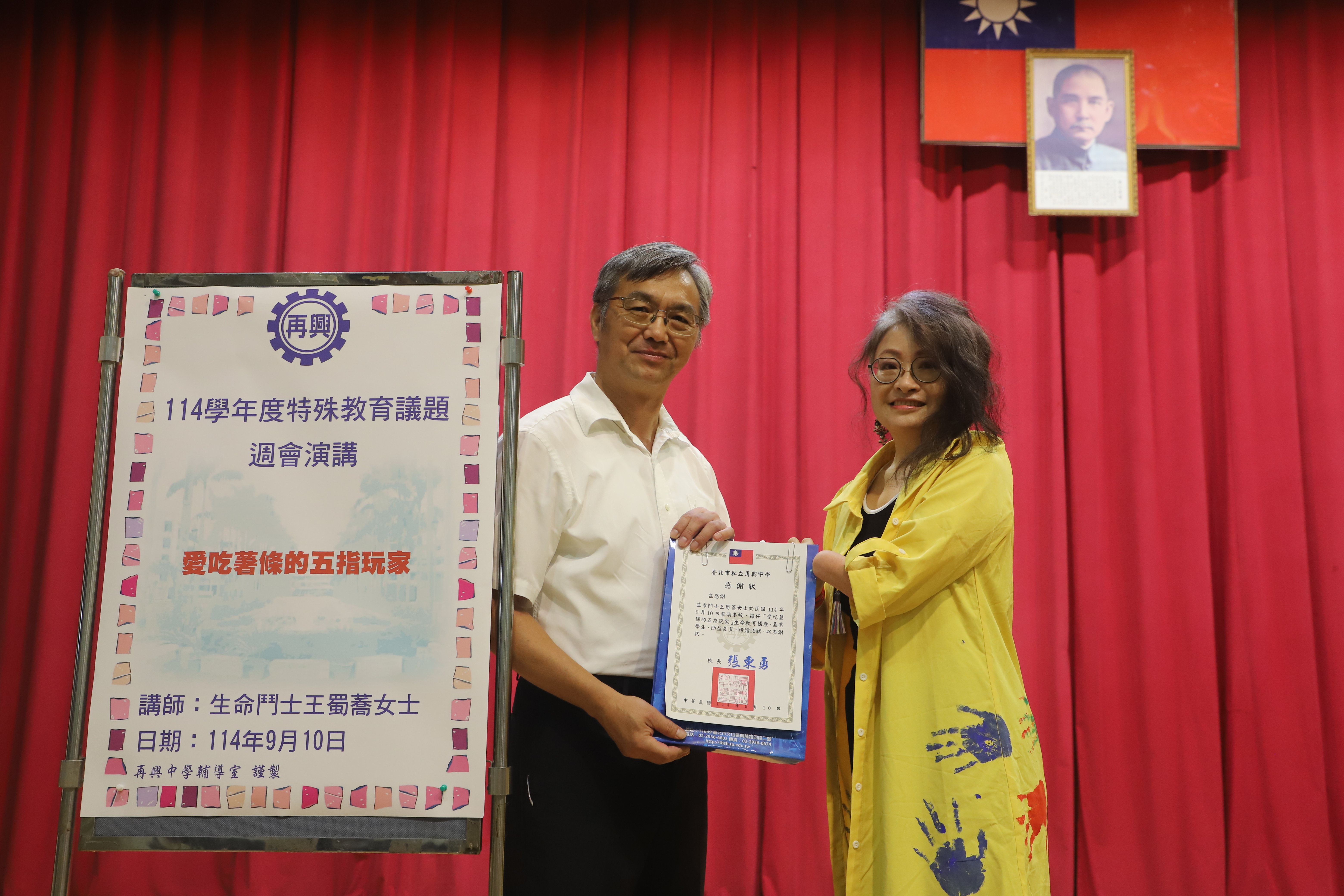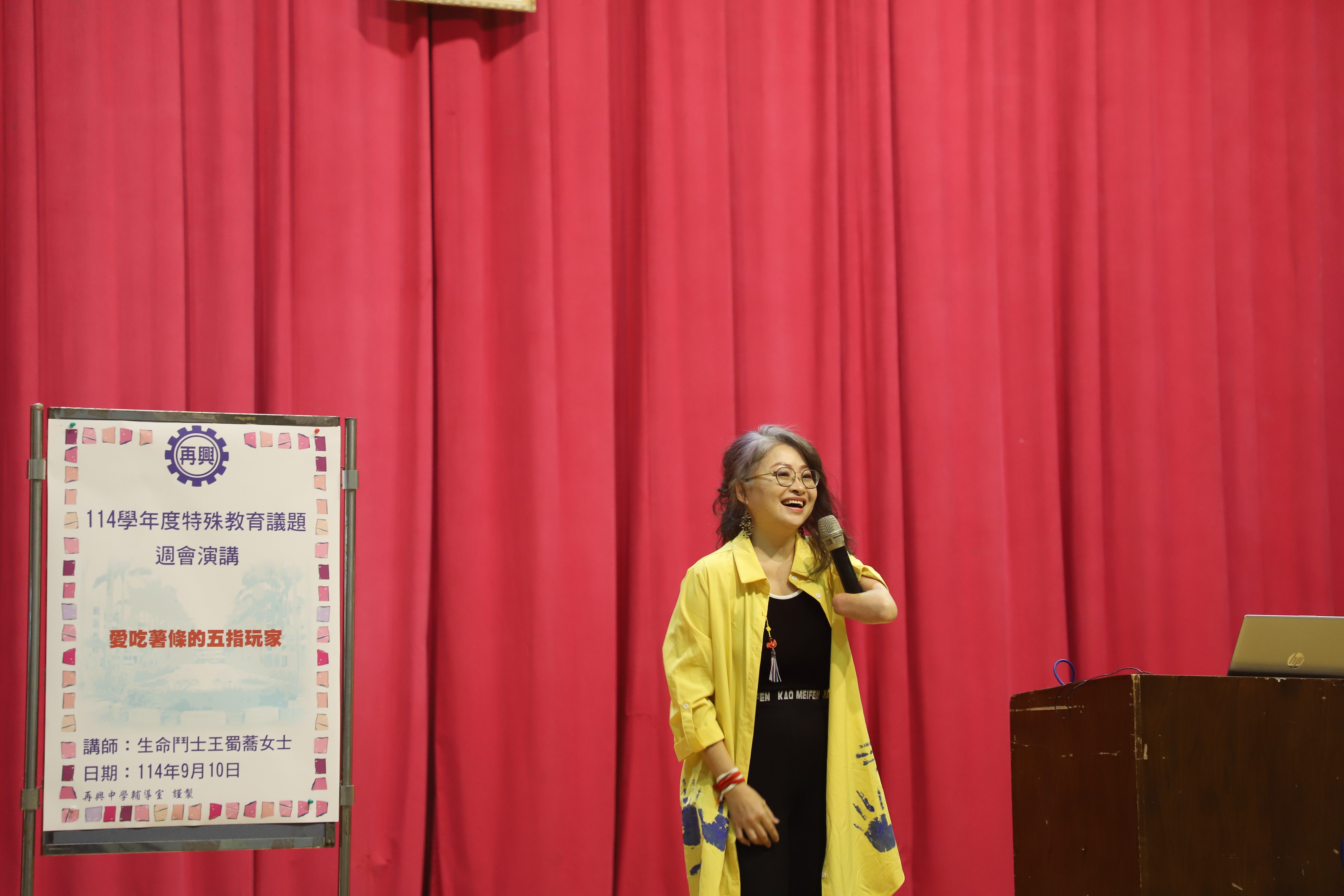 114學年度第一學期生命暨特殊教育講座 愛吃薯條的五指玩家 114年9月10日(星期三)輔導室很榮幸的邀請到生命鬥士王蜀蕎女士蒞臨本校分享充滿挑戰但豐厚的人生經歷。 王老師小時候因為陪媽媽在雞肉攤工作,想幫忙絞肉時造成左手截肢,童年時期負面思緒纏繞,不知道生命的意義為何,但家人悉心照顧,王老師長大後透過藝術與舞蹈復健開啟了許多生命探索,雖然人生路上不斷遭受挫敗始終沒有放棄,甚至透過書法與藝術陸續做了許多創作發想,原創靈感源源不絕,甚至出國進行國際分享,成為中華甲骨文藝術協會創會理事,並榮獲周大觀全球熱愛生命獎章。 中年之後因母親車禍成為植物人最後離世,王老師在人生谷底有所領悟,為了還在身邊的家人開始扭轉乾坤改變人生,從而走出社會協助鼓勵他人,以生命影響生命,希望為世界帶動更多正向愛的能量。