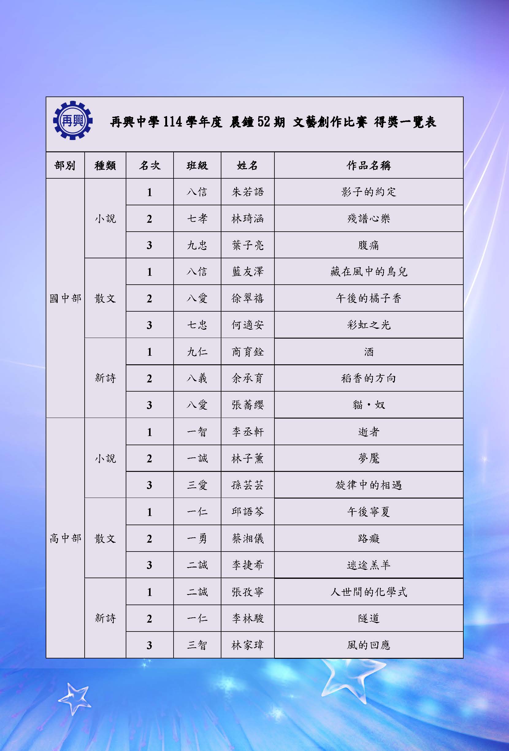 114學年度「晨鐘52期文藝創作比賽」由圖書館主辦、國文科教學研究會協辦。學生以小說、散文語新詩創作展現深厚文字素養。作品題材多元、情感真摯,巧妙結合生活觀察與文學想像,經國文科全體戮力指導,各班級學生投稿踴躍,激發創作熱情,培養學生思辨與表達能力,為校園注入濃厚的人文氣息。經國文科教學研究會評審老師審慎評審後,錄取各項目優勝作品及獲獎學生名單如下: