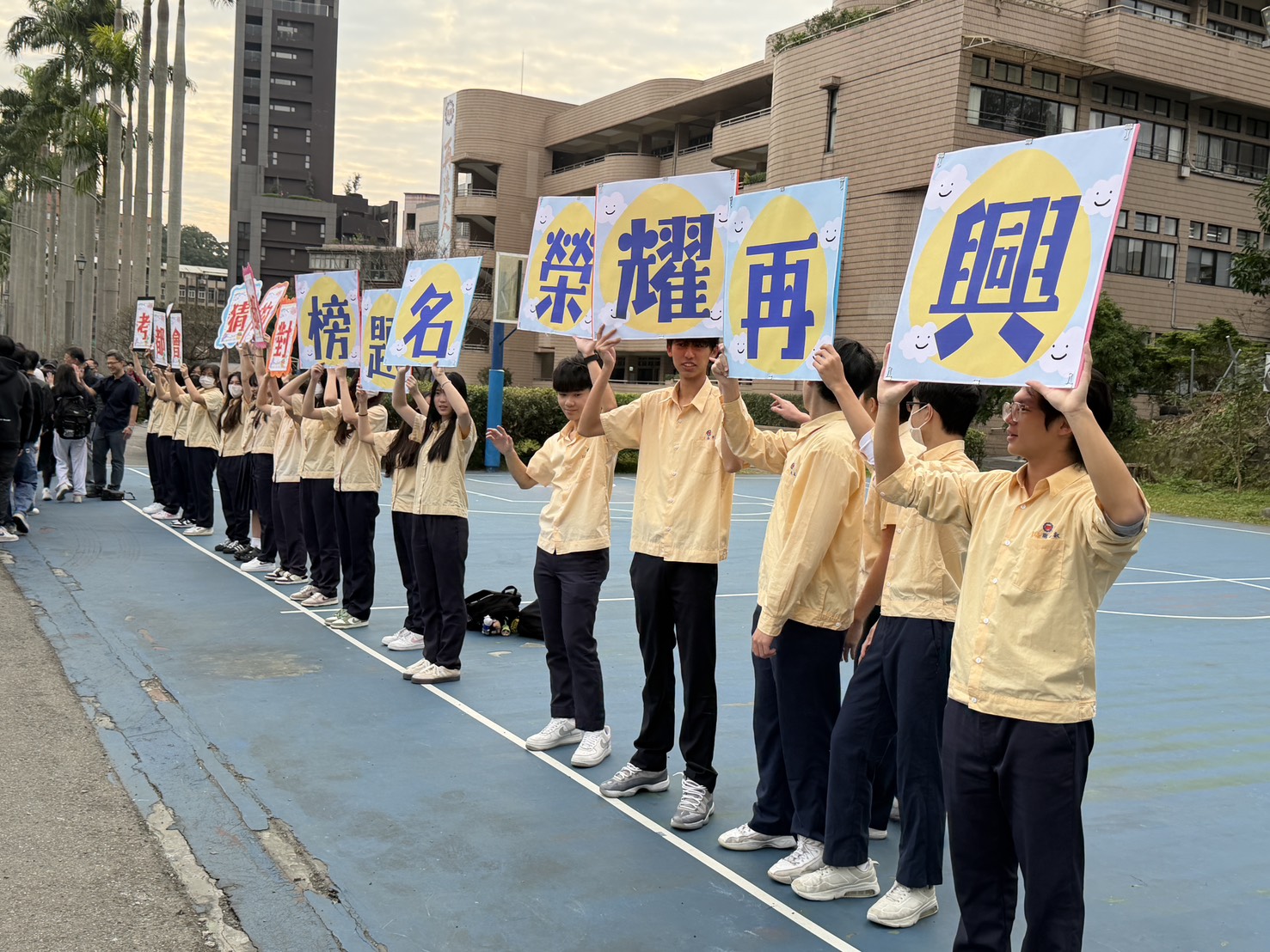 為勉勵今年參與115學年度學科能力測驗的高三考生,再興中學班聯會特別精心製作加油看板,齊聲高喊「考的都會、猜的都對、金榜題名、榮耀再興」等激勵口號,校園內充滿應援熱忱。 在考試出發當日,由張東勇校長親自率領各處室主任、組長及各科老師們,齊聚籃球場,為考生們舉行壯行儀式。師長們溫暖的擁抱與擊掌加油、學弟妹的熱血聲援,不僅減輕了應考的壓力、增強了信心,更凝聚了校園情感。在此預祝每位考生都能發揮實力,在3天的學測中都能有超常發揮,考取心目中理想的學校,也為校爭光!