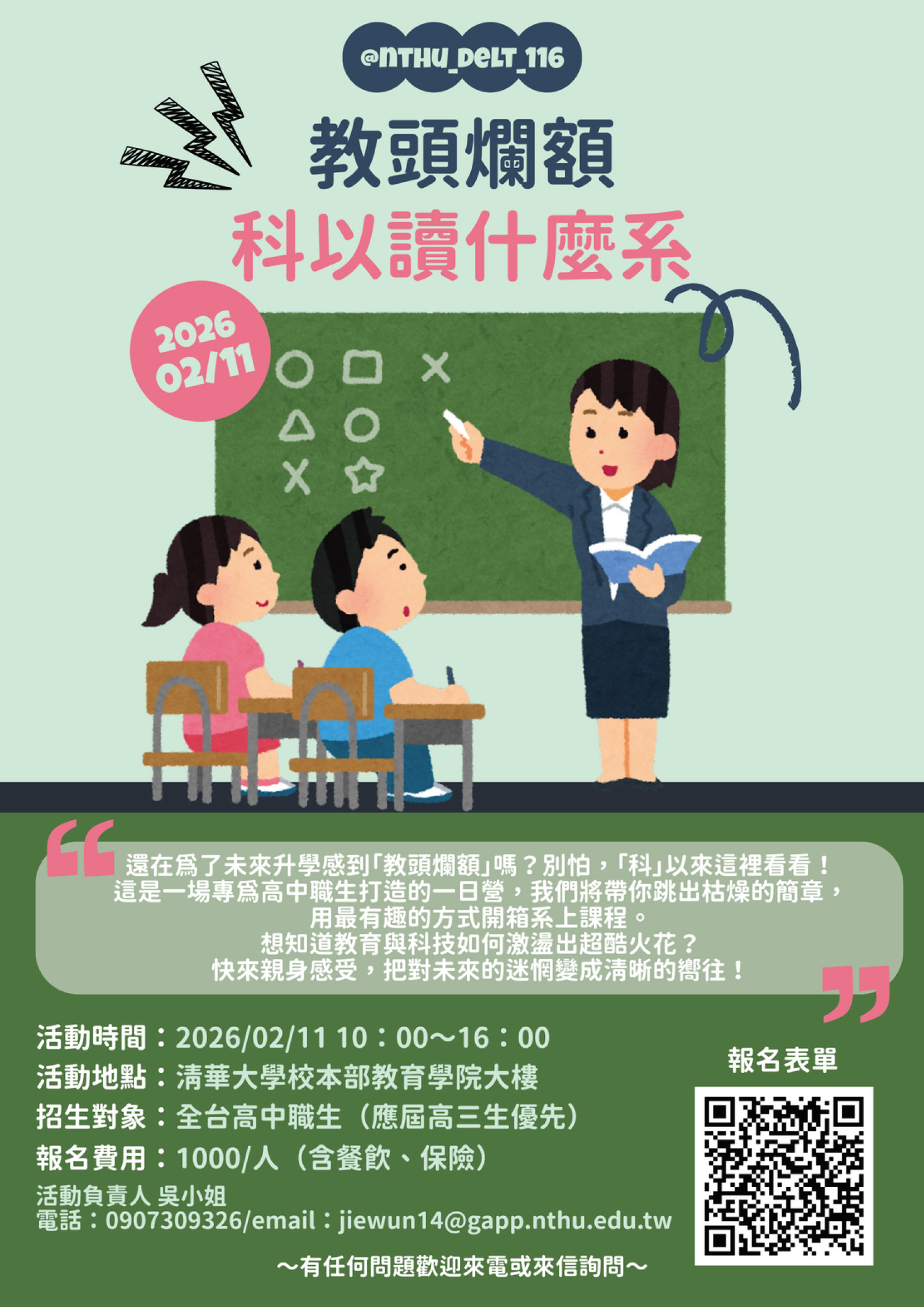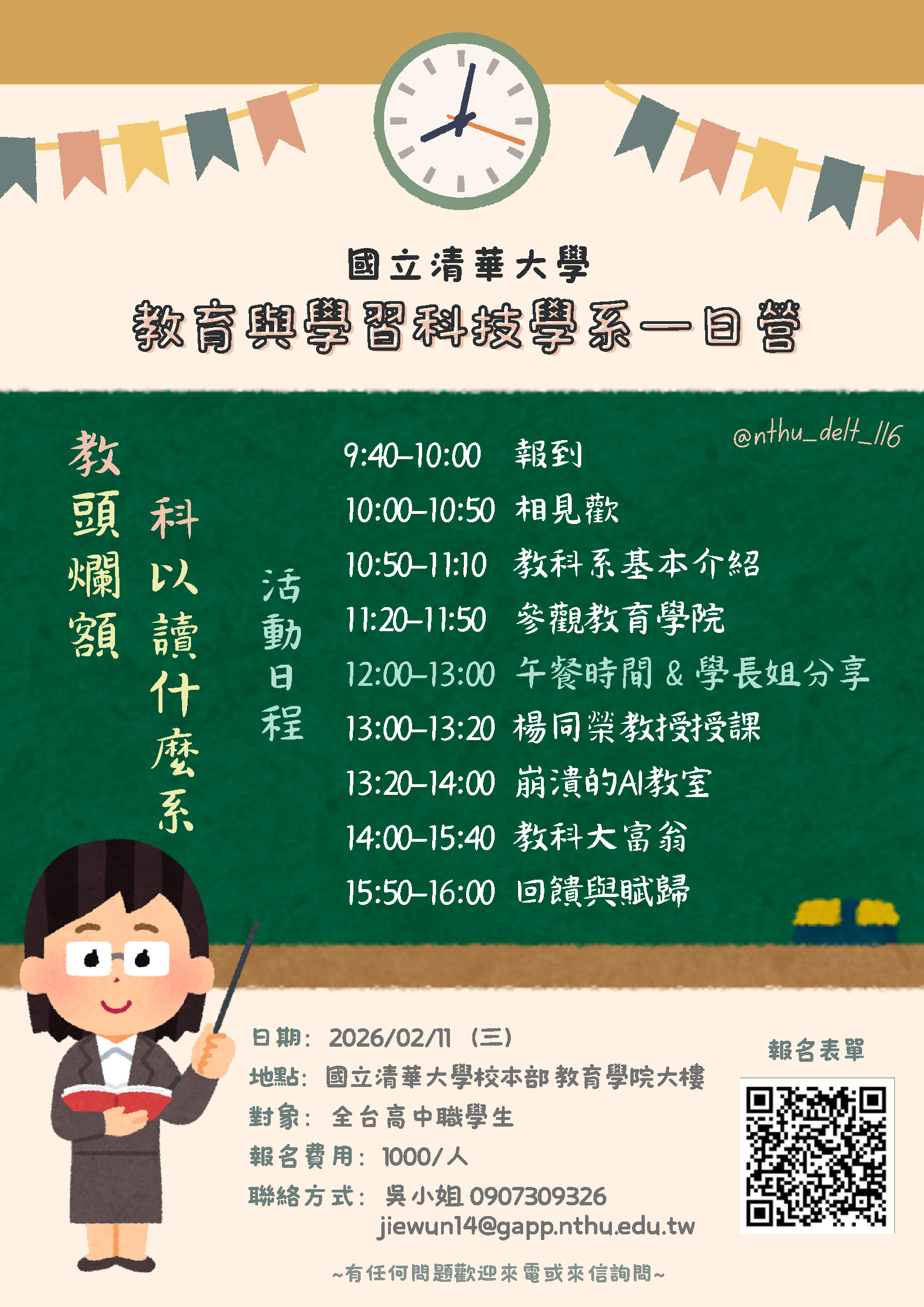 說明: 一、本校教育與學習科技學系辦理「2026教科營~教頭爛額,科以讀什麼系!」,邀請高中學生前來參觀並進行師生交流活動,提早探索體驗大學課程。 (一)活動日期:115年2月11日(星期三)上午10時至下午4時。 (二)活動地點:本校校本部竹師教育學院大樓(地址:新竹市光復路二段101號)。 (三)報名時間:即日起至115年2月7日(星期六)下午5時止。 (四)報名費用:1,000元/人(包含保險、餐食)。 二、報名連結:https://forms.gle/EH3EgyKXrcV16wXV9。 三、活動負責人:吳小姐,聯絡電話:0907309326,Email:jiewun14@gapp.nthu.edu.tw。國立清華大學「2026教科營~教頭爛額,科以讀什麼系!」