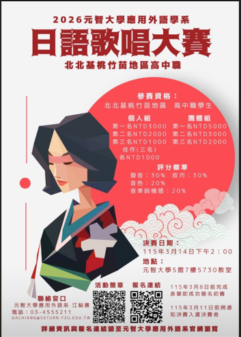 二、參賽資格:本次比賽以北北基桃竹苗高中/職校學生為對象,歡迎所有對日語歌唱有興趣的學生參加。