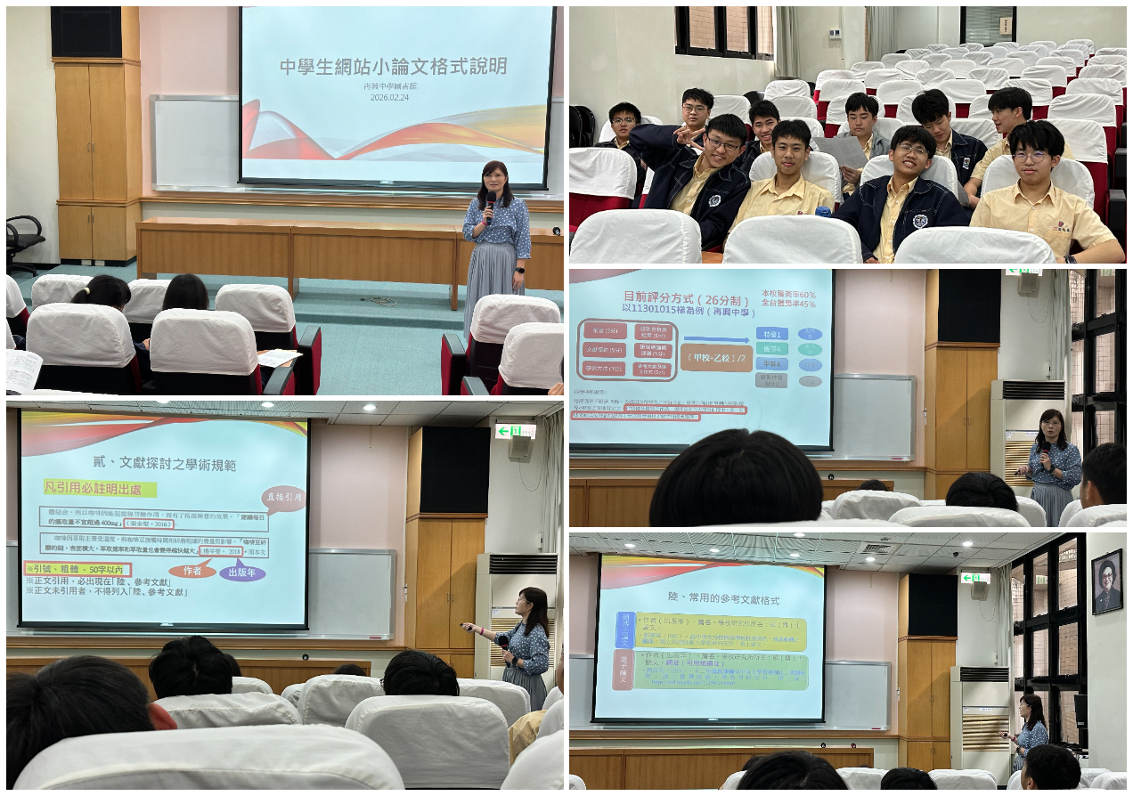 為培養校內學術研究風氣,提升同學透過閱讀與討論的自主學習能力,圖書館於 2 月 24、25 日假知新樓B1視聽教室,舉辦「中學生網站小論文寫作競賽投稿注意事項說明會」。