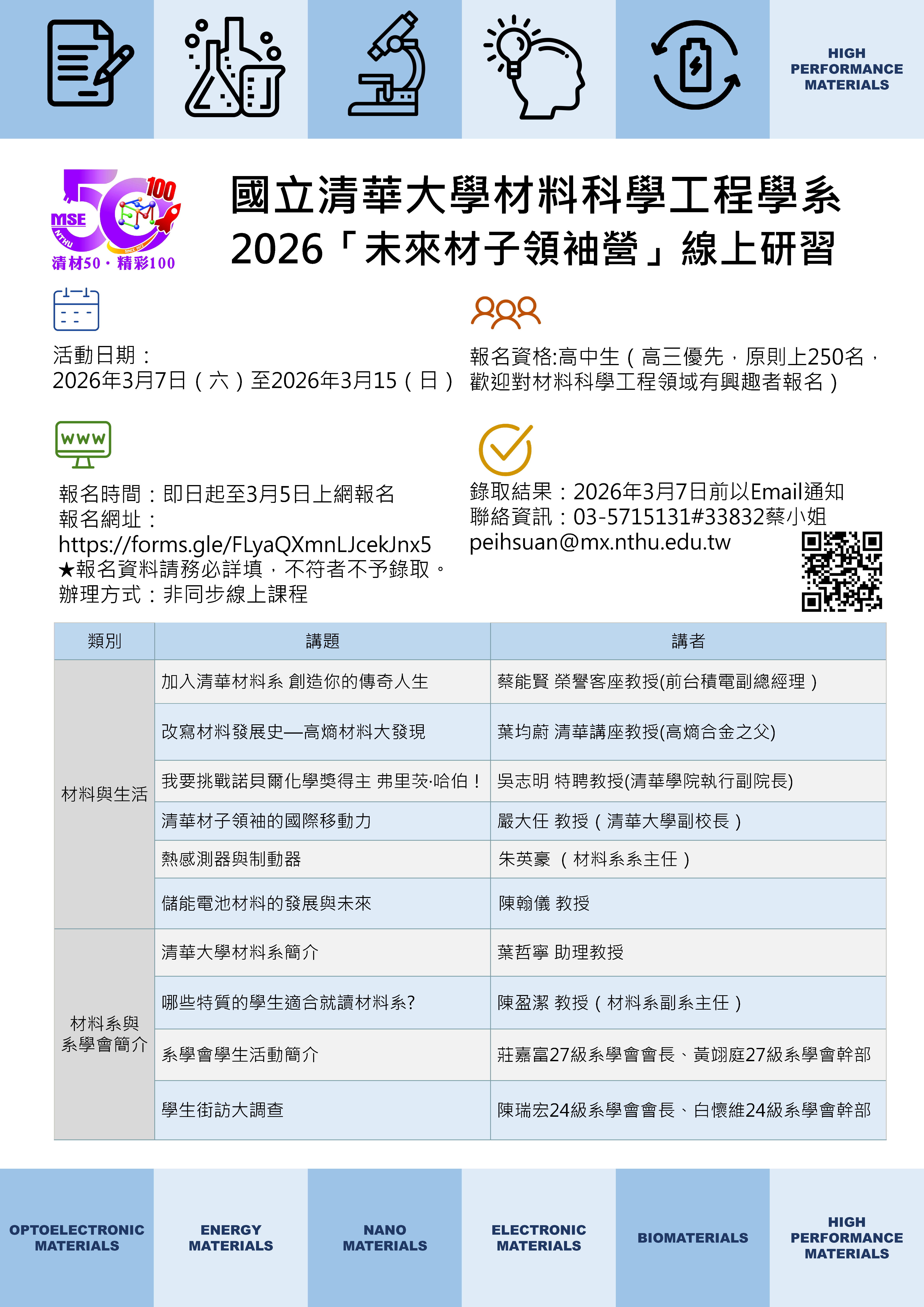 國立清華大學 材料科學工程學系「未來材子領袖營」 說明: 一、活動名稱:2026「未來材子領袖營」線上研習。 二、活動日期:115年3月7日(六)至115年3月15(日)。 三、高中生(高三優先,原則上250名,歡迎對材料科學工程領域有興趣者報名)。 四、報名網址:https://forms.gle/FLyaQXmnLJcekJnx5。 五、相關訊息公告於本校材料科學工程學系首頁「最新消息」:https://mse.site.nthu.edu.tw。
