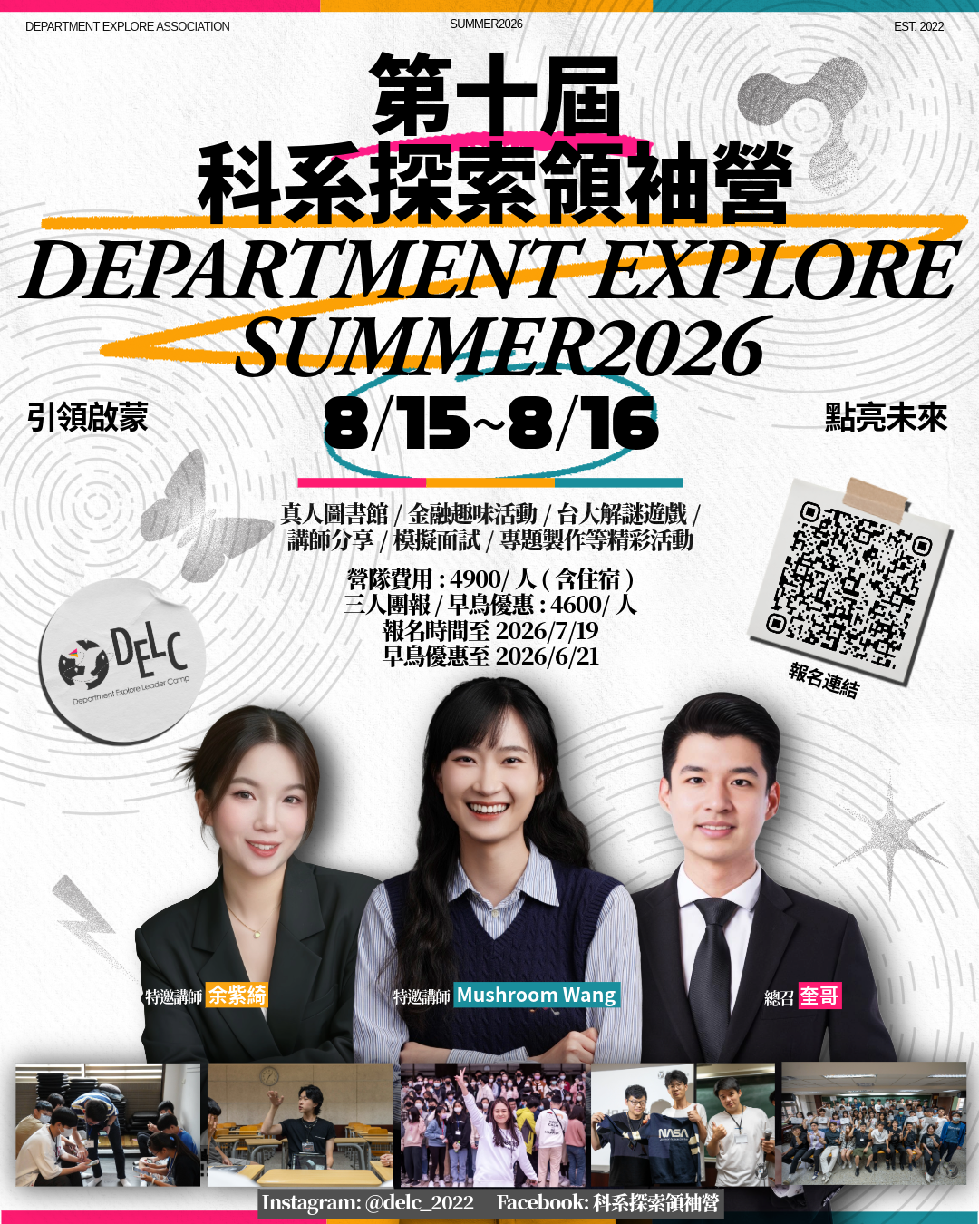 第十屆 台大科系探索領袖營 我們是「台大科系探索領袖營」,我們是一個致力於協助高中生進行科系探索的營隊,並定期舉辦單一科系職涯講座,我們的系列活動獲台北市政府青年局的指導,2026暑假我們營隊即將邁入第十屆,活動結束我們也頒發結業證書。 以下提供營隊詳細資訊供您參考: 【營隊資訊】 l 日期:2026/8/15(六)~2026/8/16 (日) l 地點:國立台灣大學校園及周邊校區 l 費用:NT$4900/人;3人團報/早鳥優惠:NT$4600/人。 (早鳥時間到2026/6/21,營隊報名截止時間:2026/7/19) l 活動特色: - 學長姐演講:邀請學習型網紅與學生分享自身求學歷程如大考準備心得、時間管理、生涯探索等主題。 - 真人圖書館:邀請各領域人士如醫師、牙醫師、工程師、律師、精算師、大學教授等,至營隊面對面解惑科系迷思及未來出路,也曾邀請到台大電機院長、經濟系教授、師大地科系主任、政大法律系教授、中山醫醫學系主任來營隊分享 - 模擬面試:因應入學申請之面試環節,提供學生實戰面試之機會,學習自我包裝、行銷,並提供個人表現建議和面試指導。 感謝您撥冗閱讀信件,附檔包含更多營隊相關資訊。 報名表單連結:https://forms.gle/C8RgtJDNWwYBc8vV6 科系探索領袖營 我們的官方網站:https://www.minghuiedu.com/exploration 我們的IG專頁:https://www.instagram.com/delc_2022/