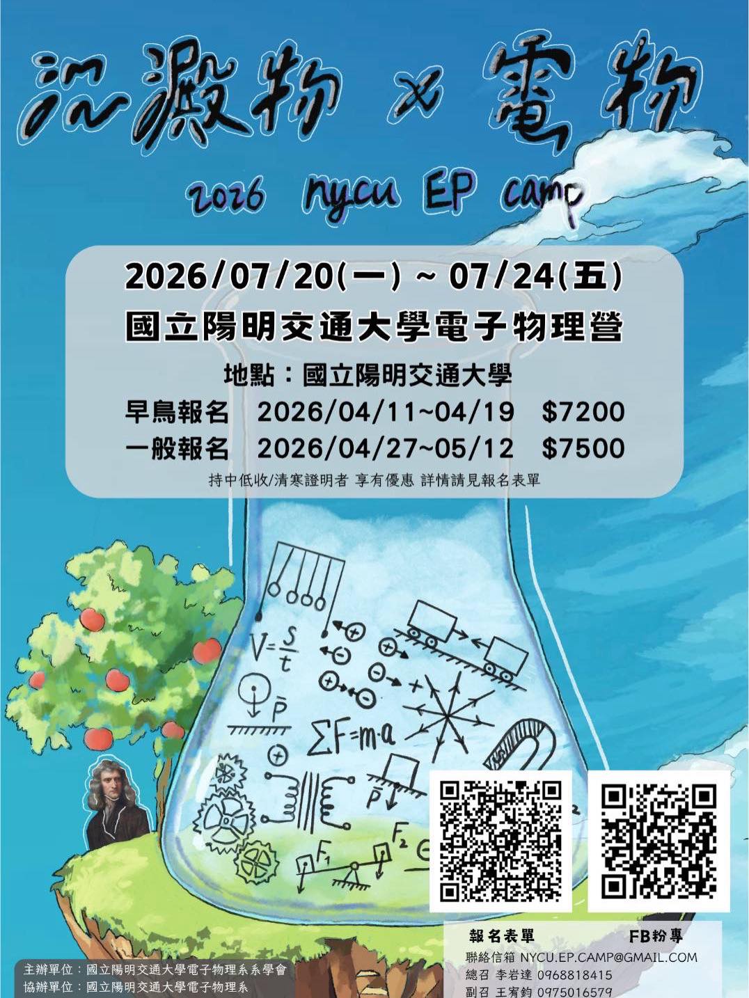 國立陽明交通大學電子物理營「沉澱物X電物」 本系為推廣電子物理相關領域之教育與發展, 活動詳情如下: ▍活動名稱:2026國立陽明交通大學電子物理營「沉澱物X電物 ▍活動日期:2026年7月20日(一)至7月24日(五)(共 ▍活動地點:國立陽明交通大學光復校區(新竹市東區大學路100 ▍參訪單位:國家同步輻射研究中心、台積創新館 ▍活動目的: 本營隊旨在引領全國高中生走進陽明交大電子物理系, 課程結合了企業參訪、實驗室探查與多項互動式實驗, ▍住宿安排:陽明交通大學光復校區學生宿舍 ▍報名時間:早鳥報名:2026年4月11日(六)至2026年 一般報名:2026年4月27日(一)至2026年5月12日( ▍錄取公告:早鳥報名:2026年4月22日(三) 一般報名:2026年5月17日(日) ▍報名費用: 早鳥:新台幣7200元整 一般:新台幣7500元整 中低收入戶:新台幣3000元整 低收入戶:免費 ▍報名表單連結: https://docs.google.com/forms/ ▍活動FB粉專(提供即時資訊與Q&A): https://www.facebook.com/ ▍活動簡章與相關附件(含海報與報名須知): https://drive.google.com/ 國立陽明交通大學 電子物理學系 系學會 聯絡人:李岩達 (總召) 聯絡電話:0968-818-415 國立陽明交通大學 電子物理學系 系學會 聯絡人:王宥鈞 (副召) 聯絡信箱:eugenewg.sc13@nycu.edu.tw 聯絡電話:0975-016-579