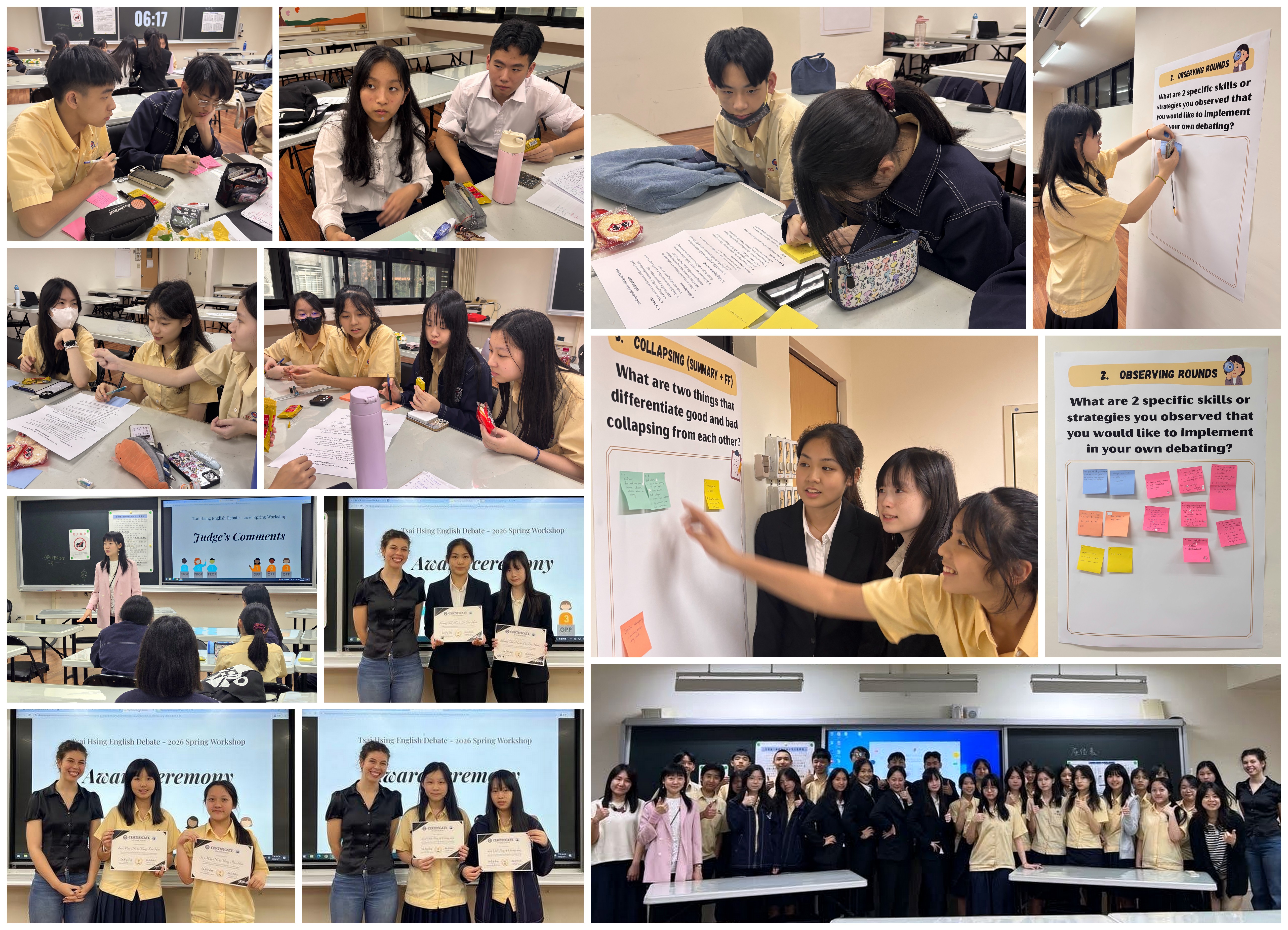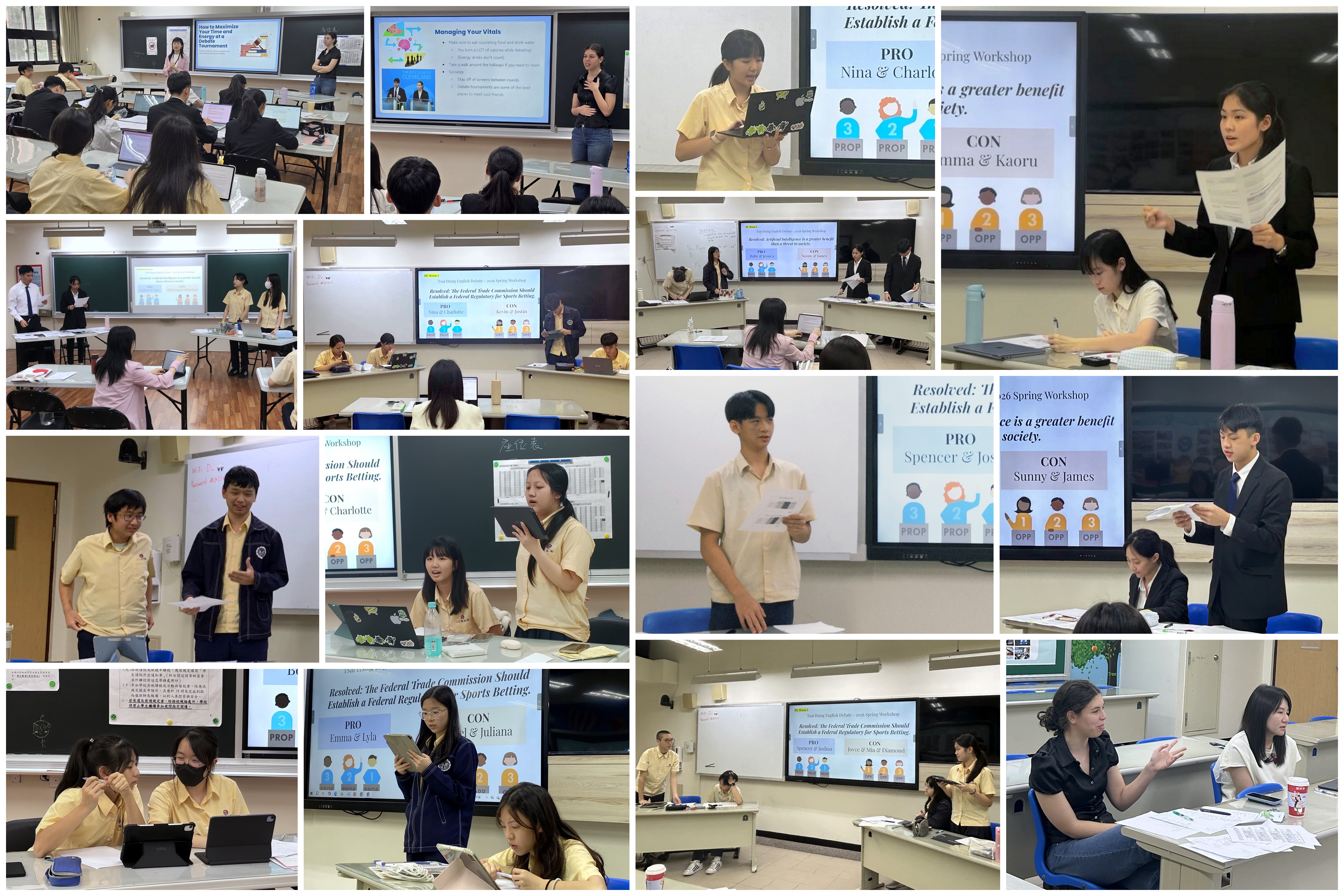 為了將這份熱情向下扎根,並持續深化學生的實戰能力,本校研發中心李秉容主任與英辯課外師Allie,偕同中師謝易軒老師、彭欣鈴老師,於今年4月11日(星期六)舉辦2026再興英語口說思辯課「週末工作坊」。這是首次專為英辯課學生量身打造的全日練習賽,初階班與進階班共 29 位學生齊聚一堂,在上下午共計四回合的密集賽事中,學生們實際應用課堂所學,在賽場上交鋒,展現出驚人的抗壓性與對成長的渴望。 首先,由李主任致詞揭開序幕,接著教練Allie進行授課,為學生建立正確的辯手心態,並再次提點賽制規則與實戰技巧。隨後學生進行第一回合的練習賽,初階班分為八組,採用NSDA賽制,辯題為Resolved: The Federal Trade Commission should establish a federal regulatory framework for sports betting. (美國聯邦貿易委員會應該建立一套針對運動博彩的聯邦監管架構)進行激辯;進階班則分為六組,採用NTNU賽制,探討議題Resolved: Artificial Intelligence is a greater benefit than a threat to society. (人工智慧對社會利大於弊)。每組皆須出賽兩回合,辯手們在台上莫不卯足全力,努力梳理邏輯,以有力的論點與例證捍衛己方立場。賽後,學生們仔細聆聽評審老師的講評,將寶貴的建議化為下一場比賽的養分,表現得愈發從容自信。 歷經四回合賽事,所有學生分成五組進行回饋與反思,在Allie引導下,各組針對指定問題寫下心得,將五彩繽紛的便條紙拼貼在海報上。學生們在教室內自由走動、觀摩彼此的想法,熱烈的討論聲此起彼落,對辯論有了更深刻的理解。活動尾聲進行大合照與頒獎,獲得兩勝佳績的組別獲頒獎狀以茲鼓勵。四位老師也高度肯定所有參與者的表現,並期勉大家:勝敗乃兵家常事,唯有保持對英語辯論的純粹熱情並持續練習,才能在思辨的道路上走得更遠。這次的工作坊,不僅是一場實戰經驗的洗禮,更是學生們在口語表達與邏輯思維上的一次華麗蛻變。期盼這顆種子能在每位再興學子心中茁壯,讓再興的英辯之火燃燒得更加耀眼!2026再興英語口說思辯課「週末工作坊」活動報導